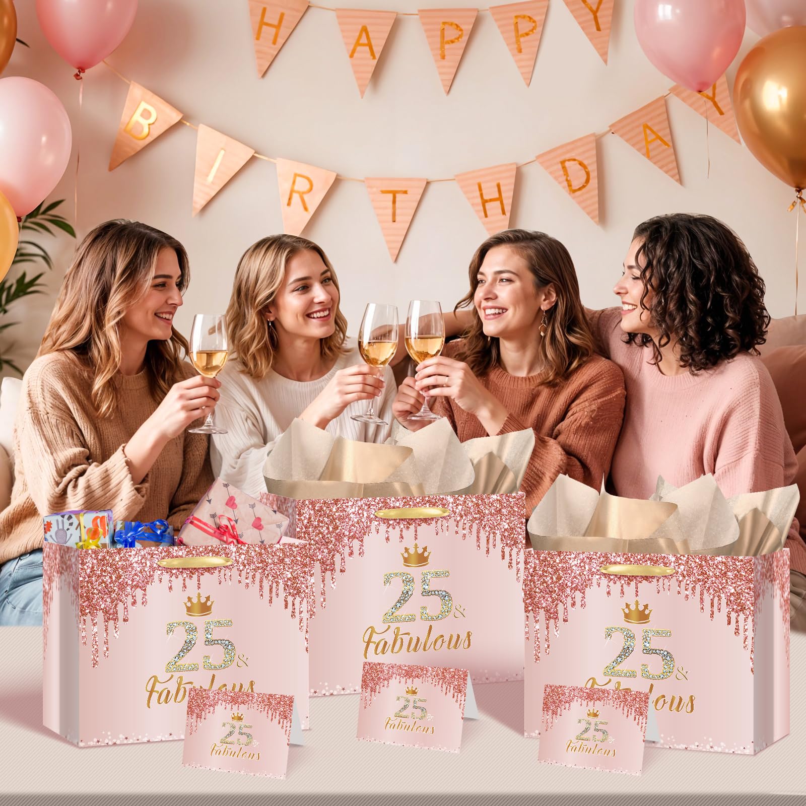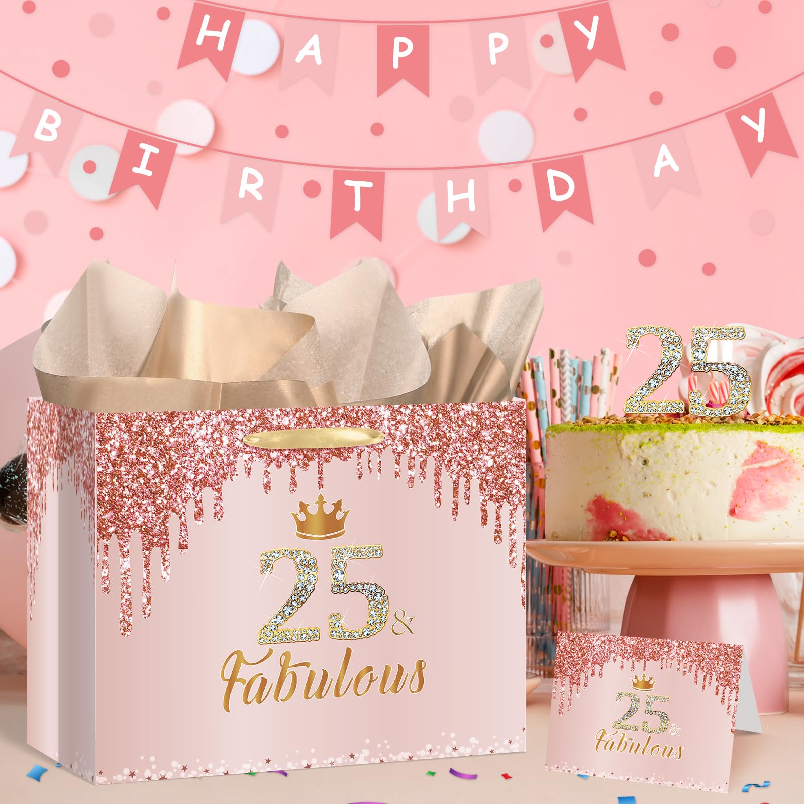 🎁【Package List】You will get a large rose gold 25 & fabulous birthday gift bag for women, a 25 & fabulous birthday greeting card and 3 pieces of 25th birthday wrapping tissue paper.