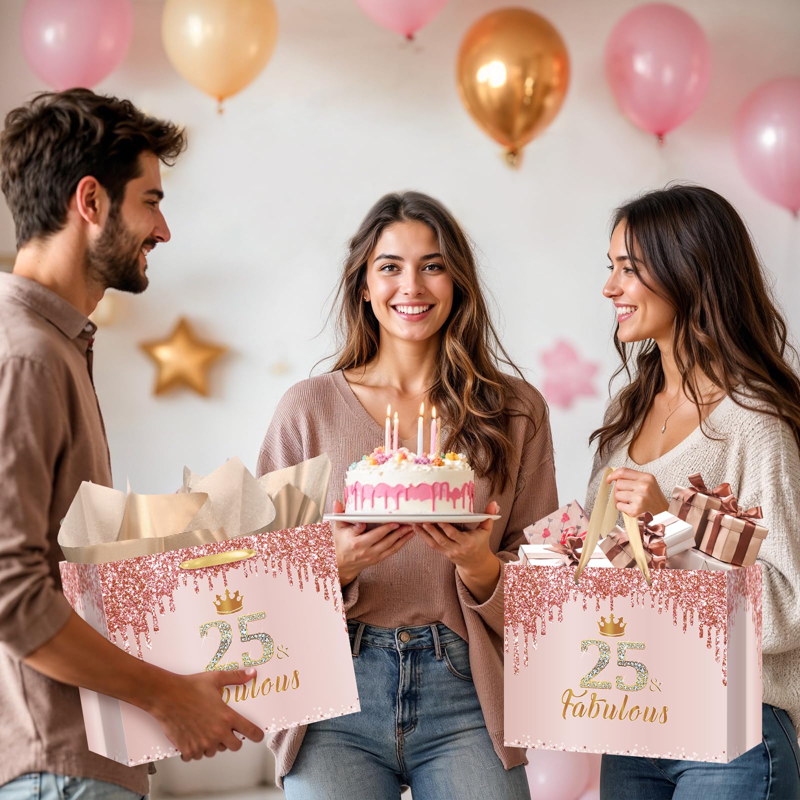 🎁【25 & Fabulous Birthday Gift Bag】The rose gold 25th birthday gift bag for women comes in rose gold, gold and silver, which features glitter rose gold prints and 25 & Fabulous.