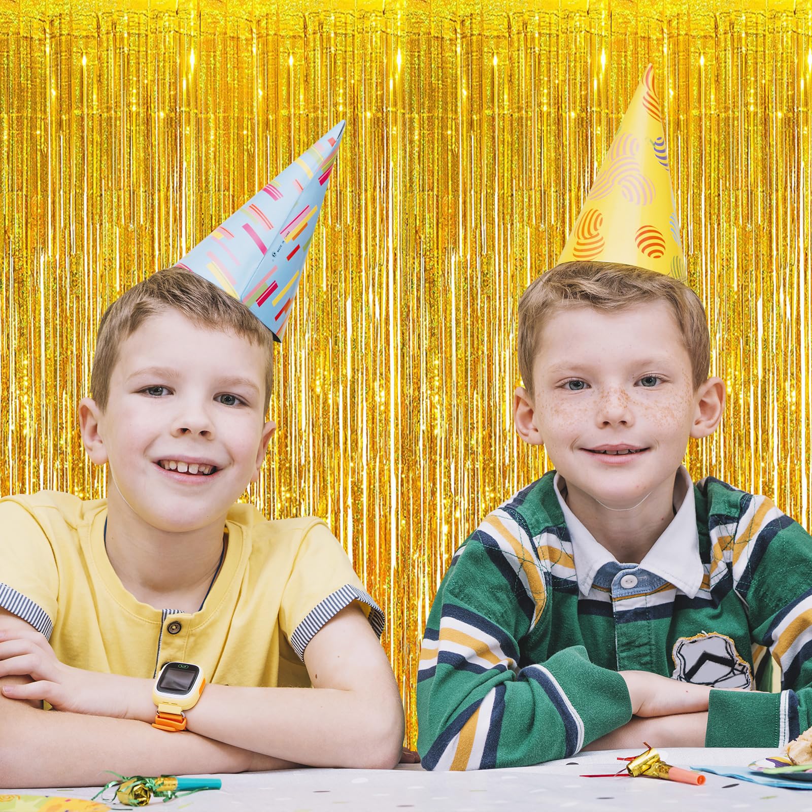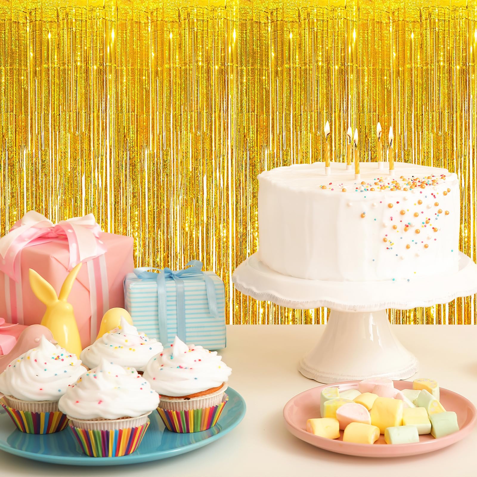 {Easy to Use}: Each pack of metallic streamer curtains has double-sided tape on the top of the back. Just tear it off easily and stick it on the wall, window, door, table or parade float for decoration. Note that the surface of the foil tinsel curtain is smooth, if you encounter knots during use, just shake it open gently.