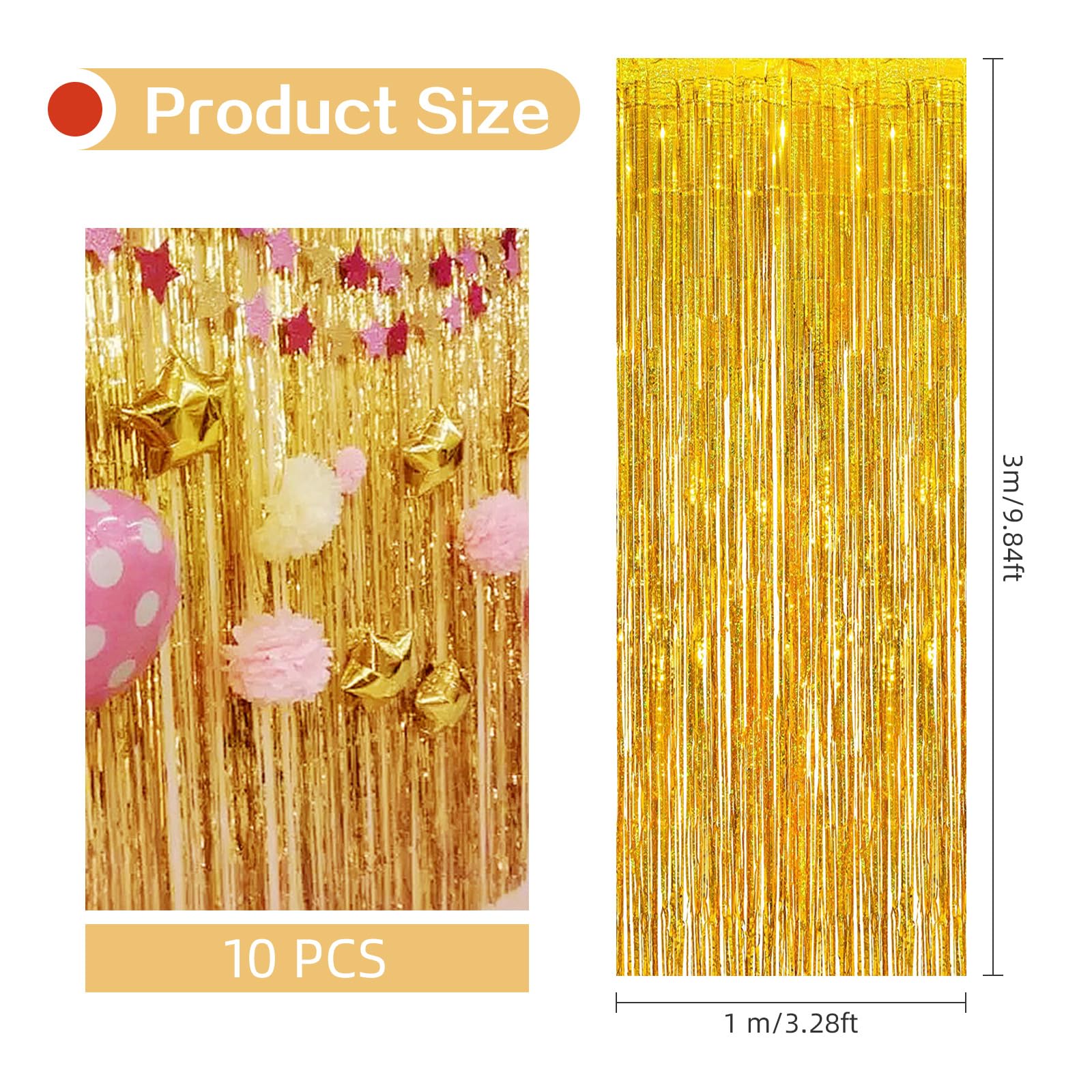 {Package and Size}: 10 Pack. Each pack size (W x L): 3.2ft x 9.8ft /1m x 3m. This 9.8 ft long and 3.2 ft wide foil fringe curtain can cover a wide area and can be cut to the required length and style to create the perfect background decoration.