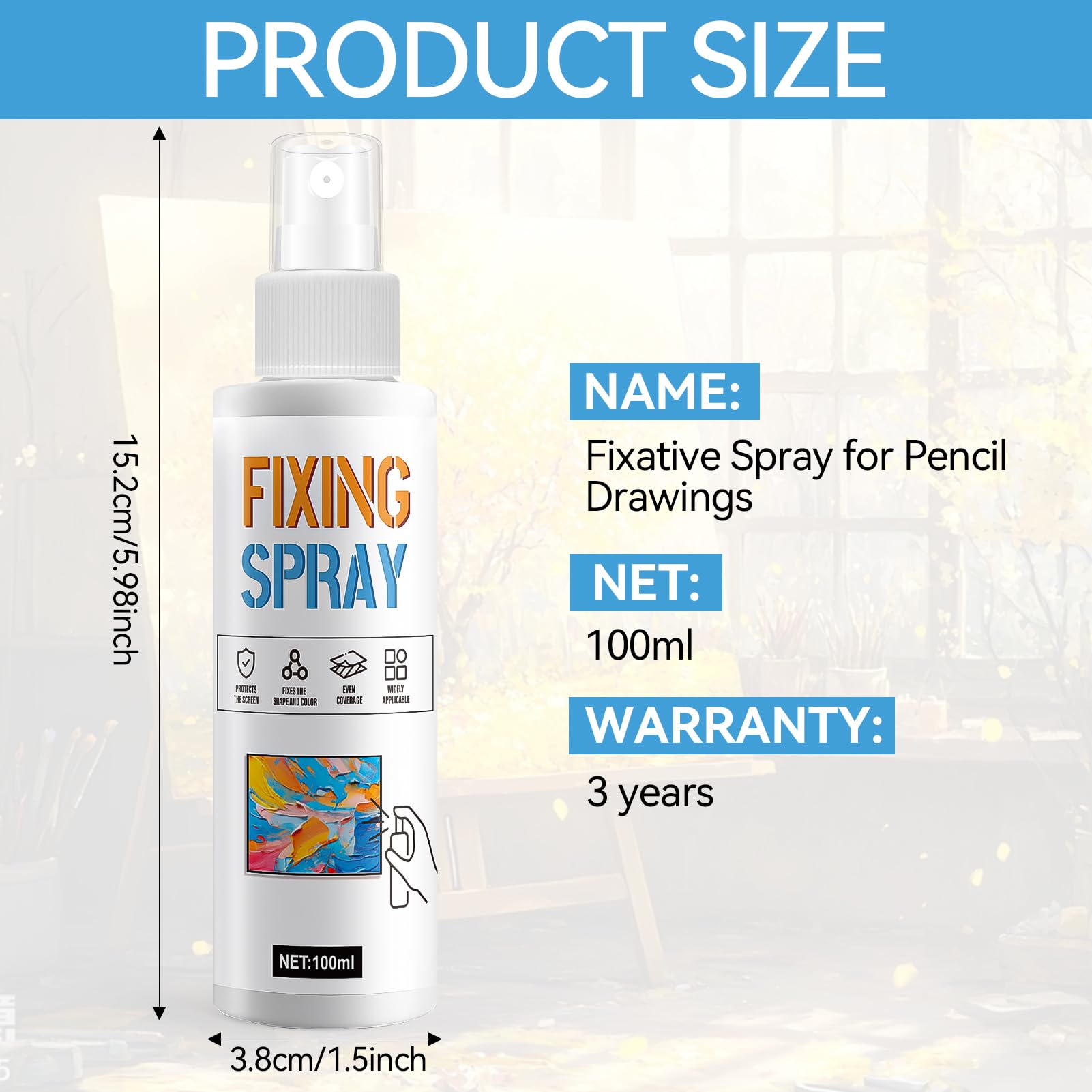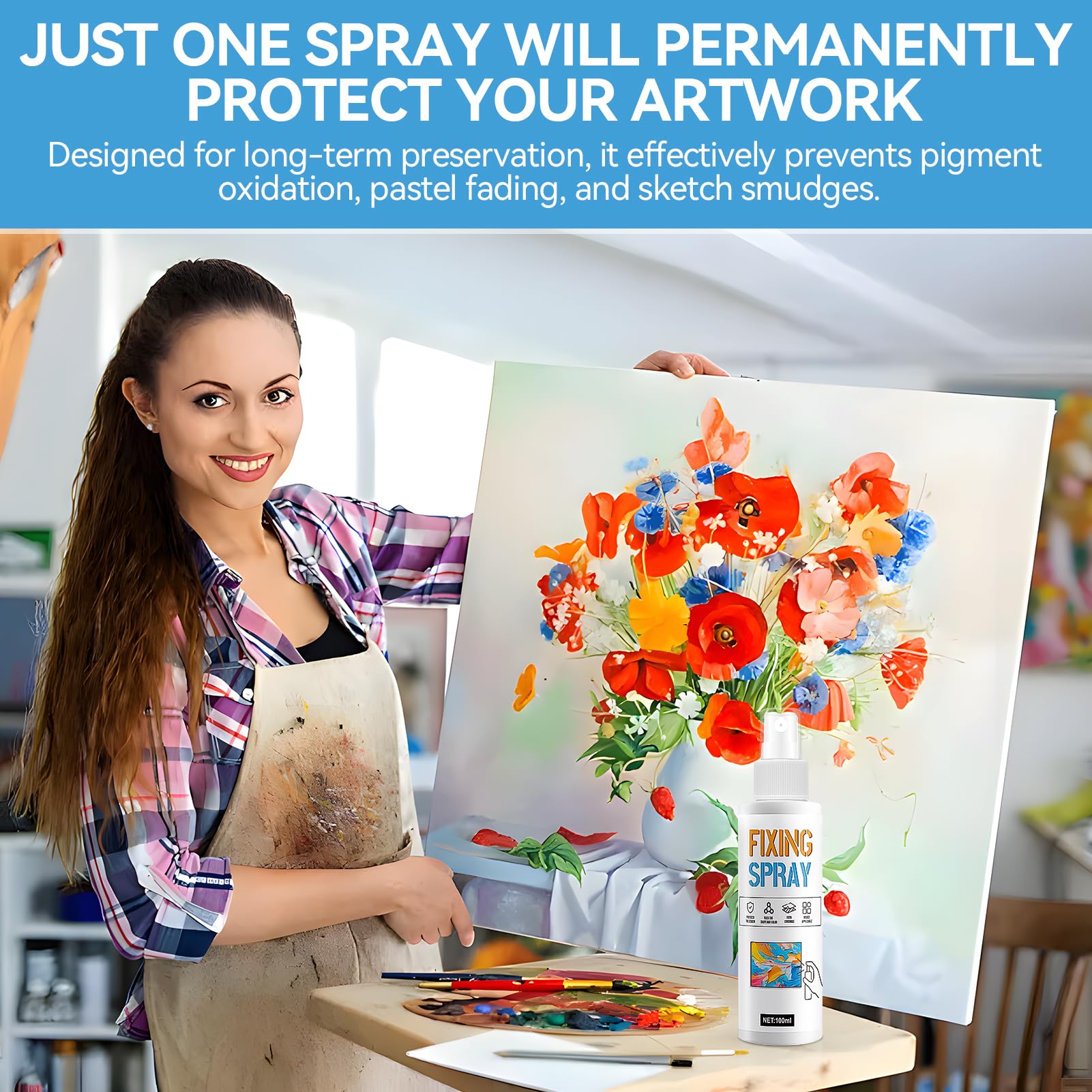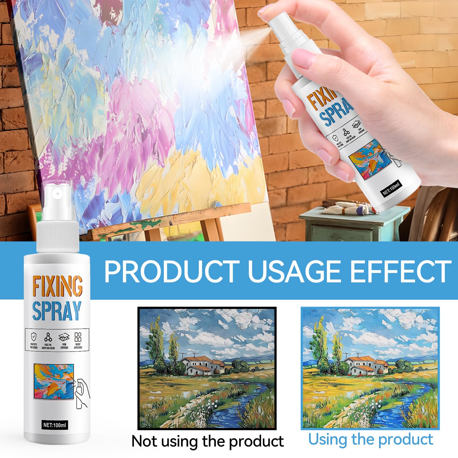 FIXATIVE SPRAY - ONE SPRAY SECURES YOUR ARTWORK, PROTECTING IT FOREVER. Designed for the long-term preservation of artworks, this fixative spray utilizes powerful protective technology to effectively prevent pigment oxidation, pastel fading, and sketch smudging. Suitable for professional painters, art students, and art enthusiasts, ensuring your work remains in perfect condition through the test of time. Applications: Watercolor/colored pencil artwork secures your work; Sketch/charcoal pencil prevents smudges; Pastel painting prevents fading; Art exam artwork protects your work. Instructions: 1. Shake the bottle gently for 10 seconds before use to ensure even mixing. 2. Hold the bottle 30-40cm away and spray evenly at a 45° angle. 3. Spray lightly and allow it to dry for 5 minutes. You can also apply a second coat for added protection. 4. Allow to dry completely before touching or mounting. Precautions: 1. Use in a well-ventilated environment. 2. Avoid spraying directly at close range to deformation. 3. Test on the edge of your work for the first time. 4. Store in a cool, dry place, away from high temperatures and freezing. 5. If the nozzle is clogged, clean it with warm water.