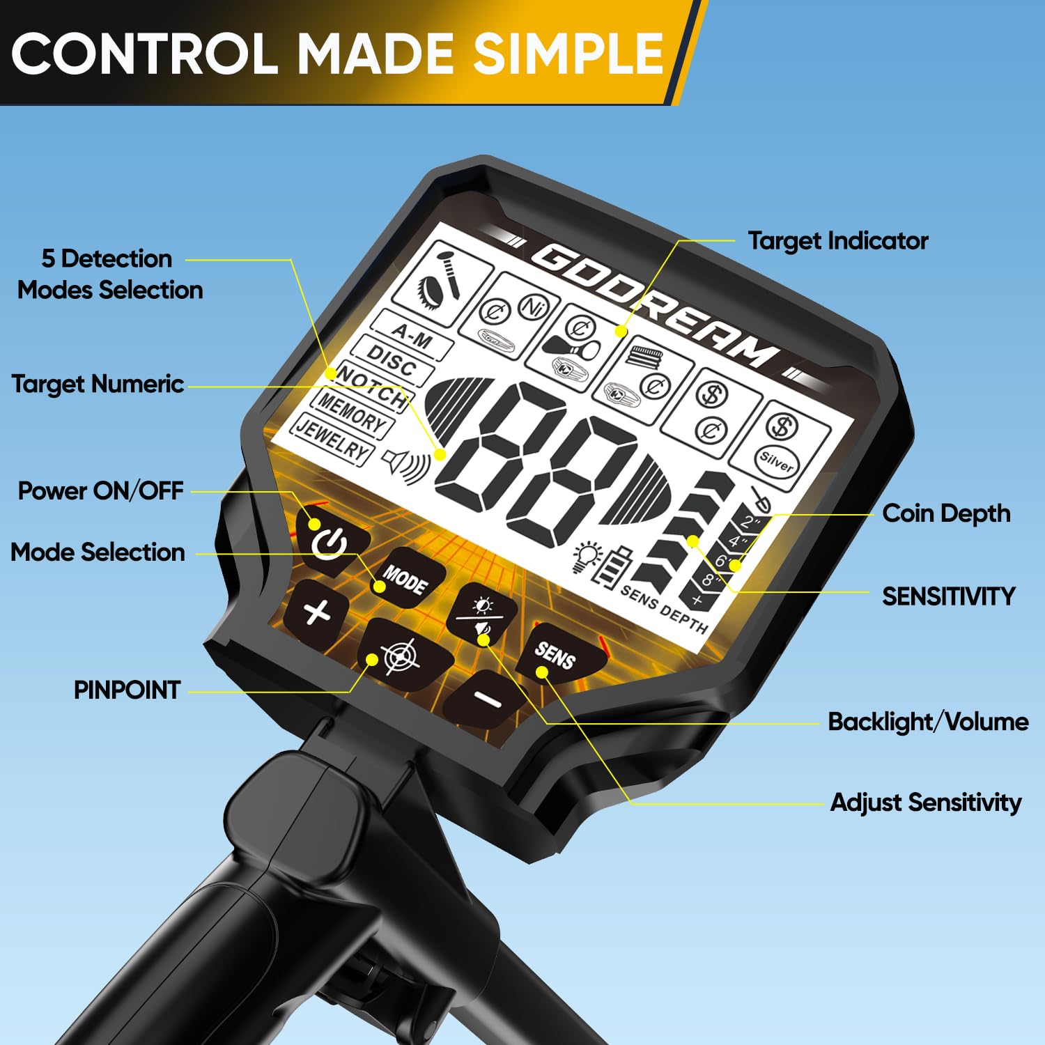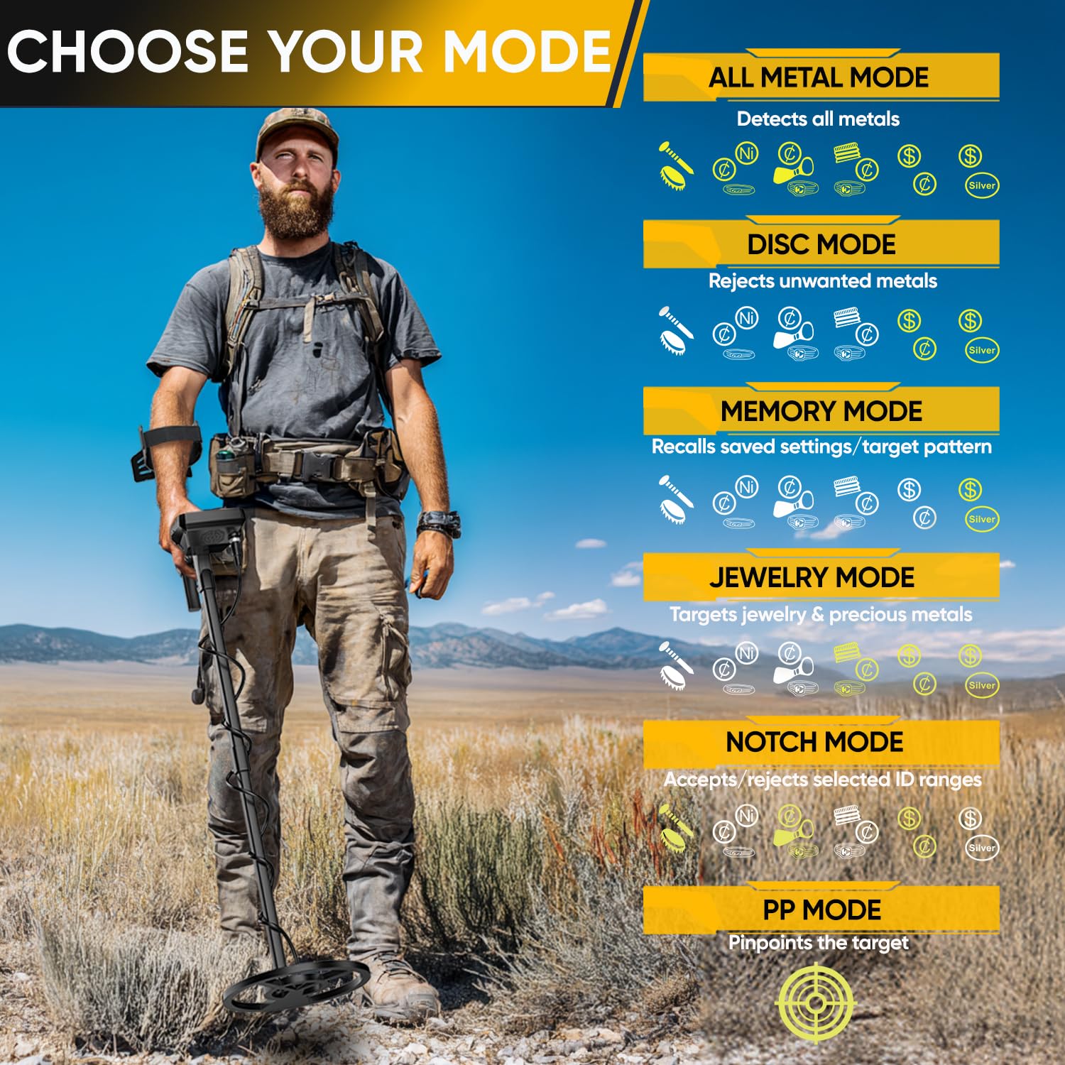 6 Detection Modes: Choose from ALL METAL, DISC, NOTCH, MEMORY, JEWELRY, and PP modes to handle different search needs. Easy for beginners to use and versatile enough for everyday treasure hunting.