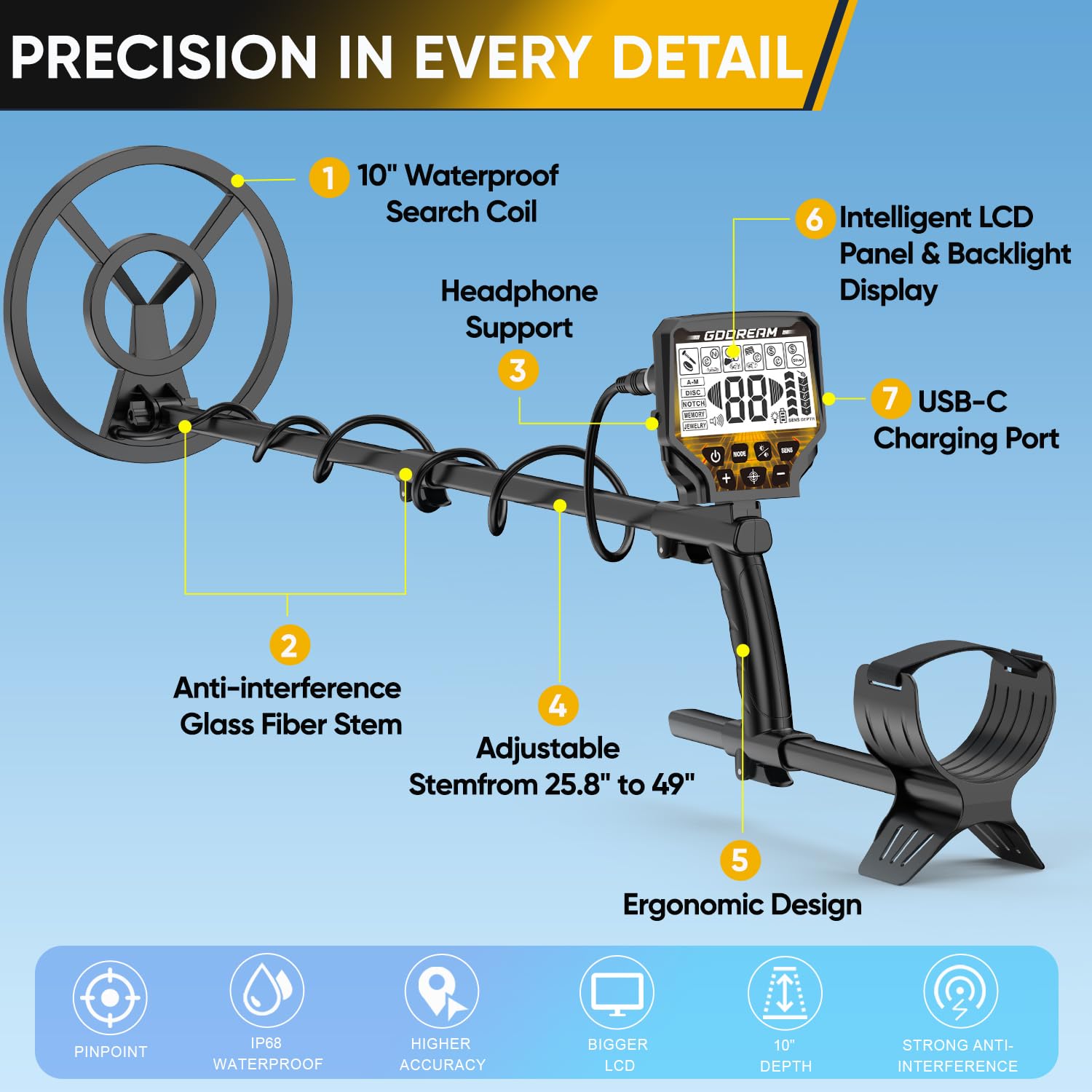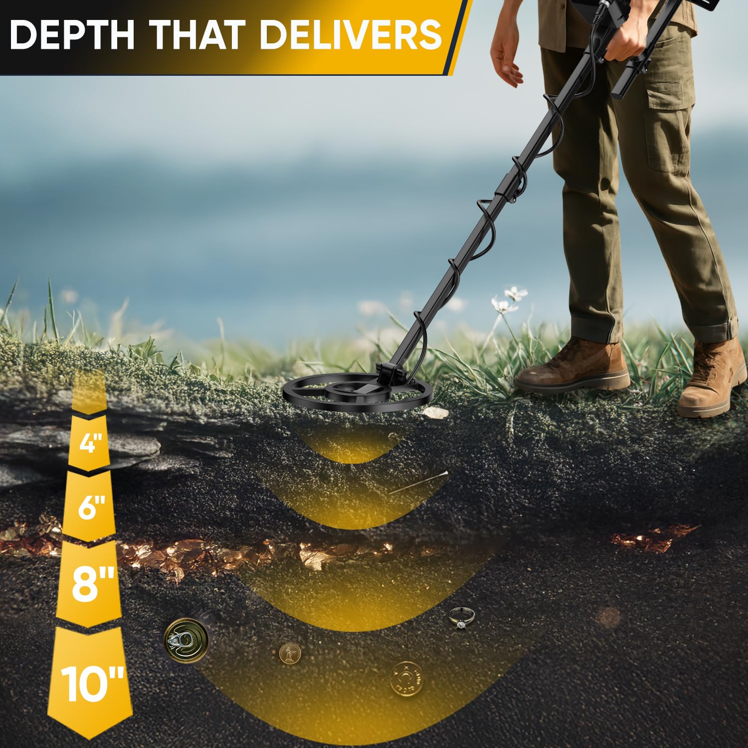 High Precision Detection: Advanced DSP chip boosts detection accuracy by 40%. Large 10-inch coil detects metals up to 10 inches deep for more precise targeting and fewer missed finds.