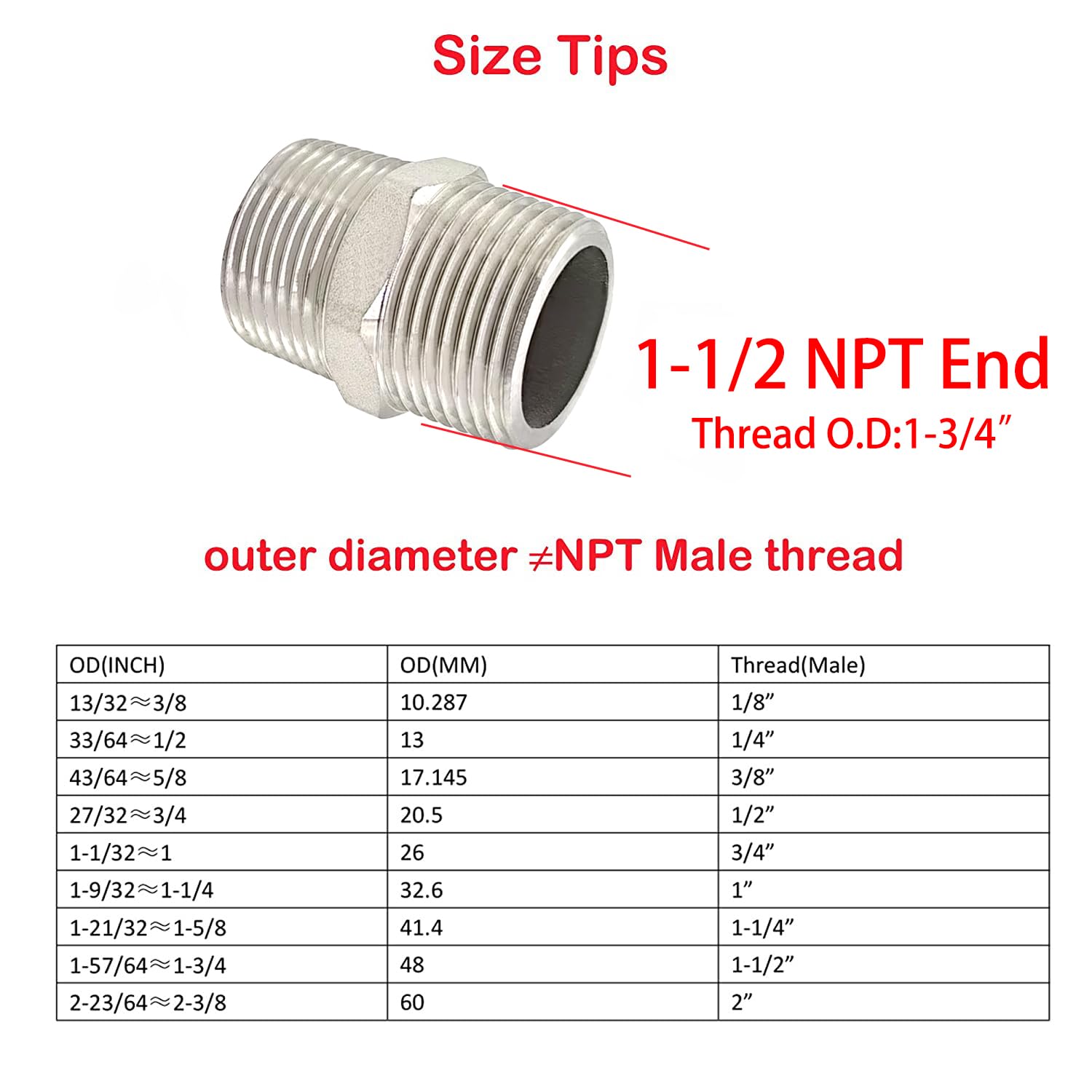 Product Features: 1. This hex nipple is 1-1/2" to 1-1/2" NPT Male End. 2. This fitting is made of 304 stainless steel for strength and resistance to corrosion. It has a temperature range from-30 to +150 degrees F and a maximum working pressure of 150 pounds per square inch (psi).