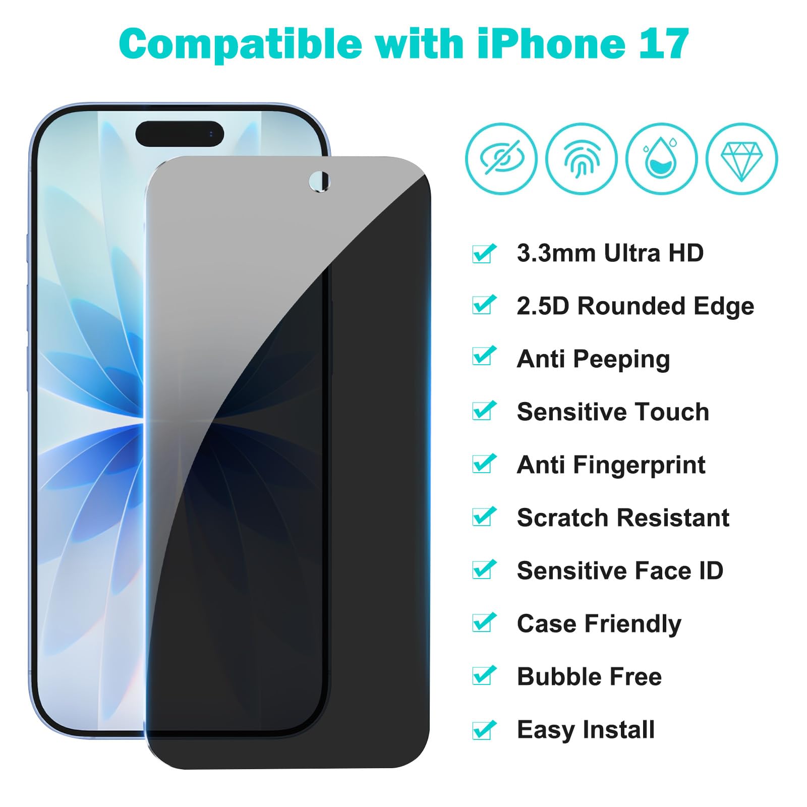 [Designed for iPhone 17] - PEHAEL's screen protector is specially designed for the iPhone 17 6.3 inch. Include 3 privacy screen protectors, 3 tempered camera lens protectors, a precision installation frame, and a cleaning kit.