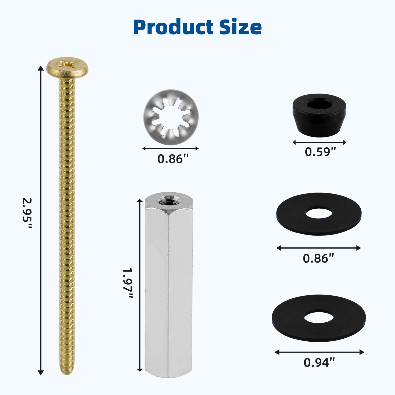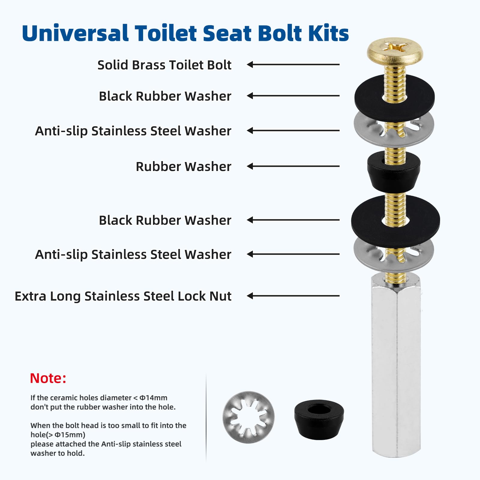 Package Includes: You will receive two pcs 3-inch brass toilet seat bolts replacement kits; two pcs 2-inch lock nuts; four pcs stainless steel anti-slip washers; six pcs black rubber washers