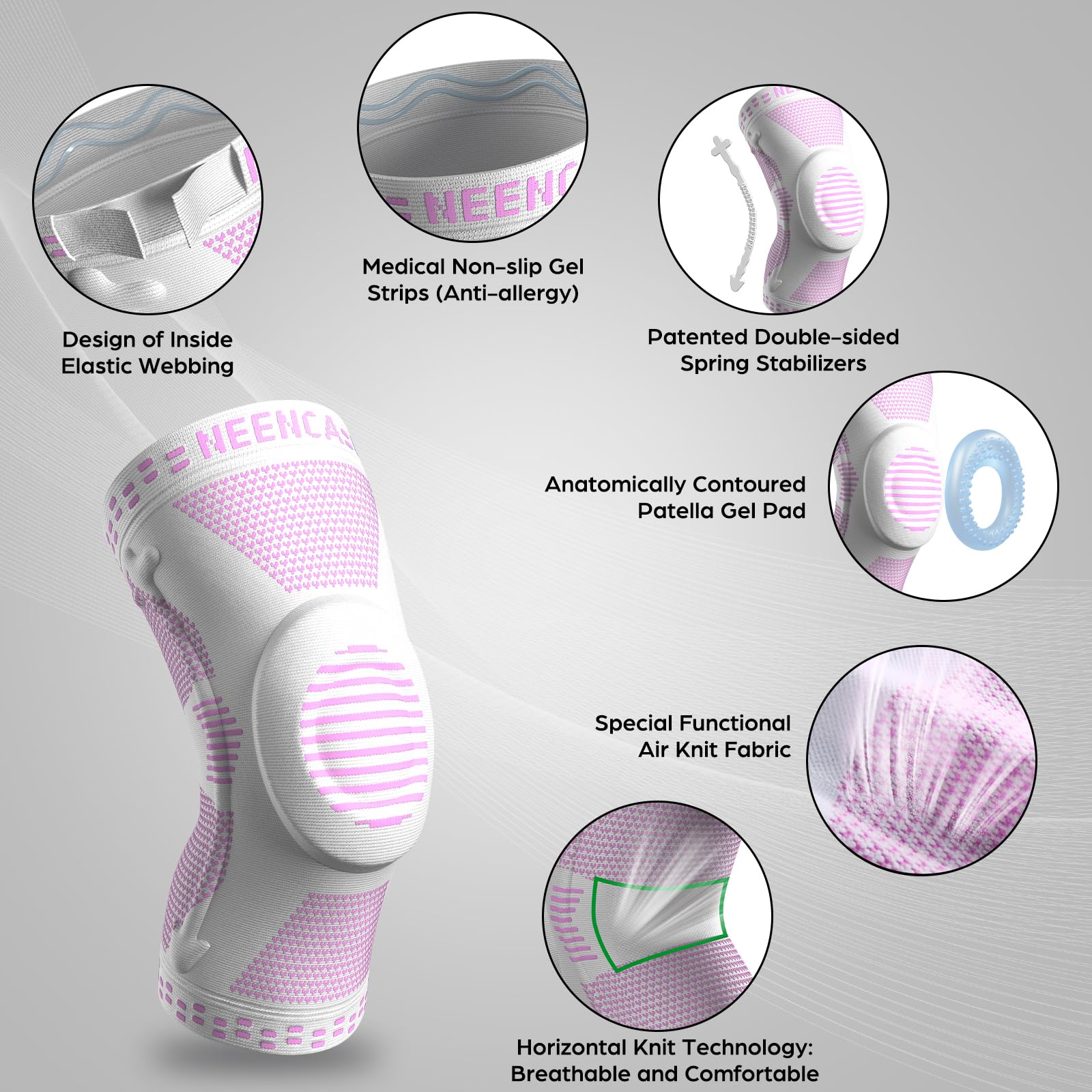 EXCLUSIVE PATENT— Spring knee support technology: An anatomically contoured patella gel pad surrounds your kneecap, dual spring stabilizers fit tightly with your knee joint. These special functional element strengthen side support and maintain joint stability, It effectively disperses knee pressure, keeping your knee warm, which will prevent potential sports injuries without limit your performance! BEST CHOICE for sports protection and knee pain relief.