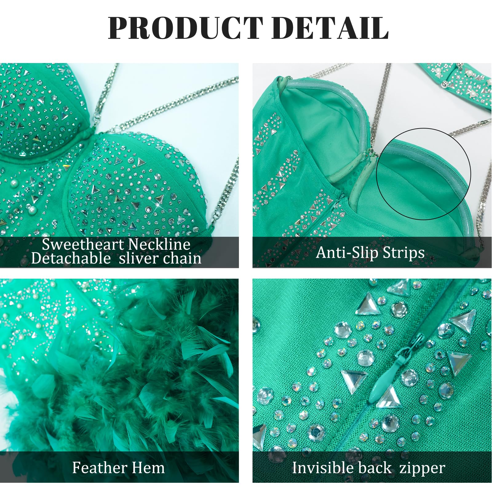 【Unique Design】 Women's sequin bodycon romper is a zip-up solid color short pants one-piece jumpsuit clubwear with feather and rhinestone deco.Versatile style in halter and strapless.