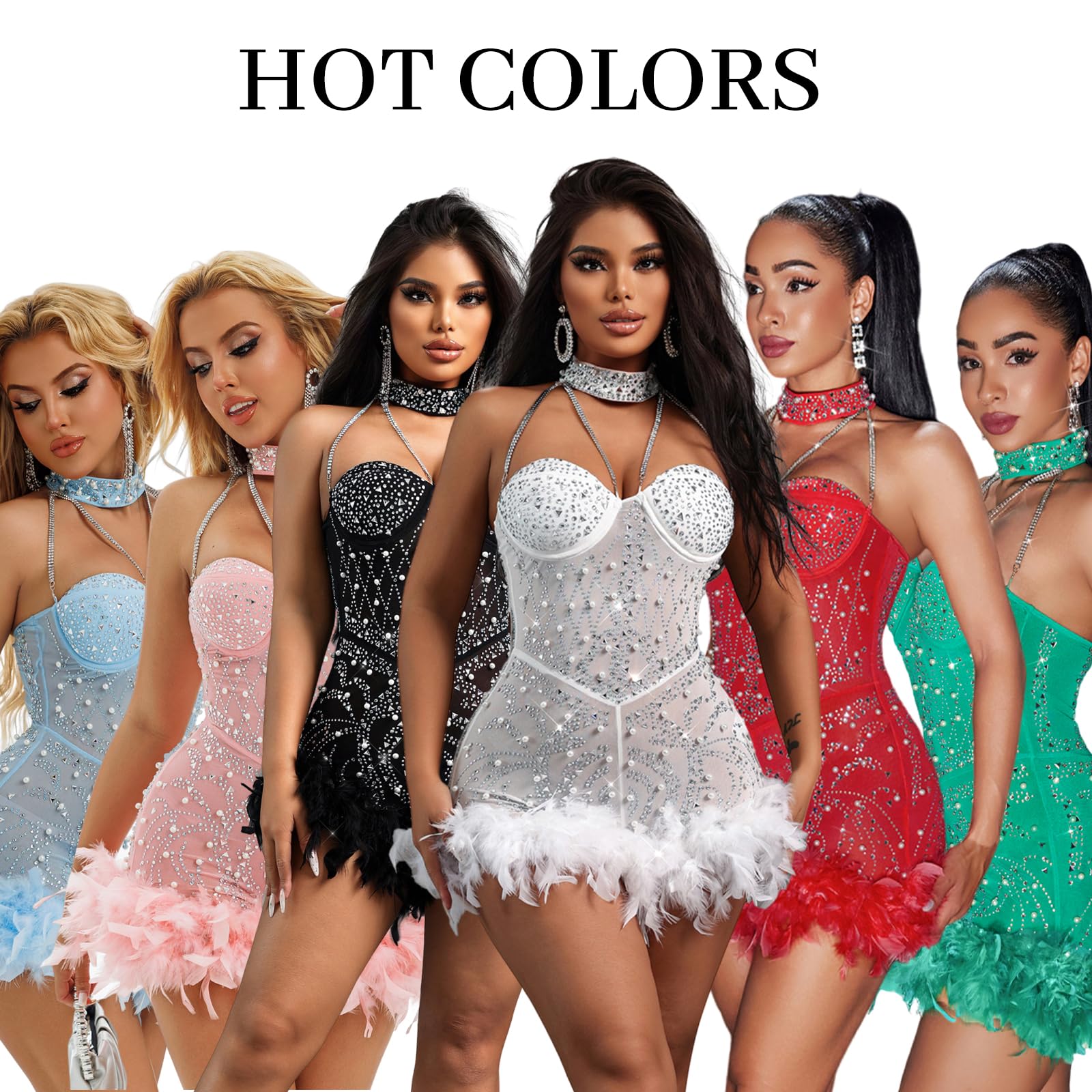 【Special Gift】The sexy rhinestone party dress showcases feminine allure with its feather hem. This super comfortable bodycon romper with silver sparkle bead is surely a great special gift for your close friend or loved ones during the sweet moments.