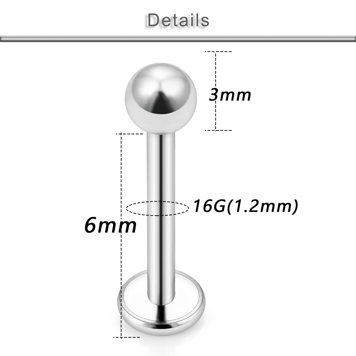 Gauge: 16G(1.2mm), Bar Length: 1/4"(6mm); Ball Size: 3mm.Color:Silver.