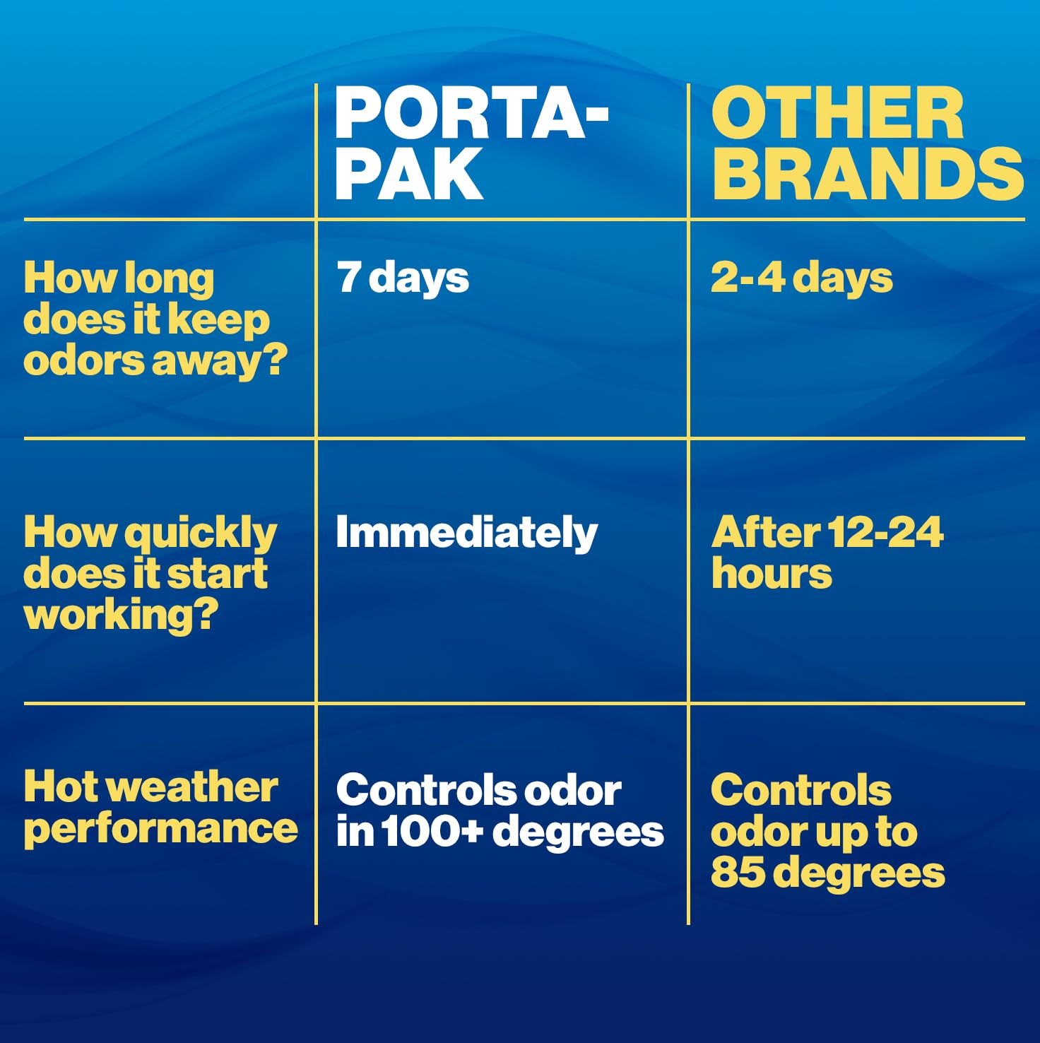 HOLDING TANK DEODORIZER - Porta-Pak marine and RV holding tank deodorizer tackles unpleasant smells. Say goodbye to embarrassing odors with your boat, camping toilet, and RV toilet tabs.
