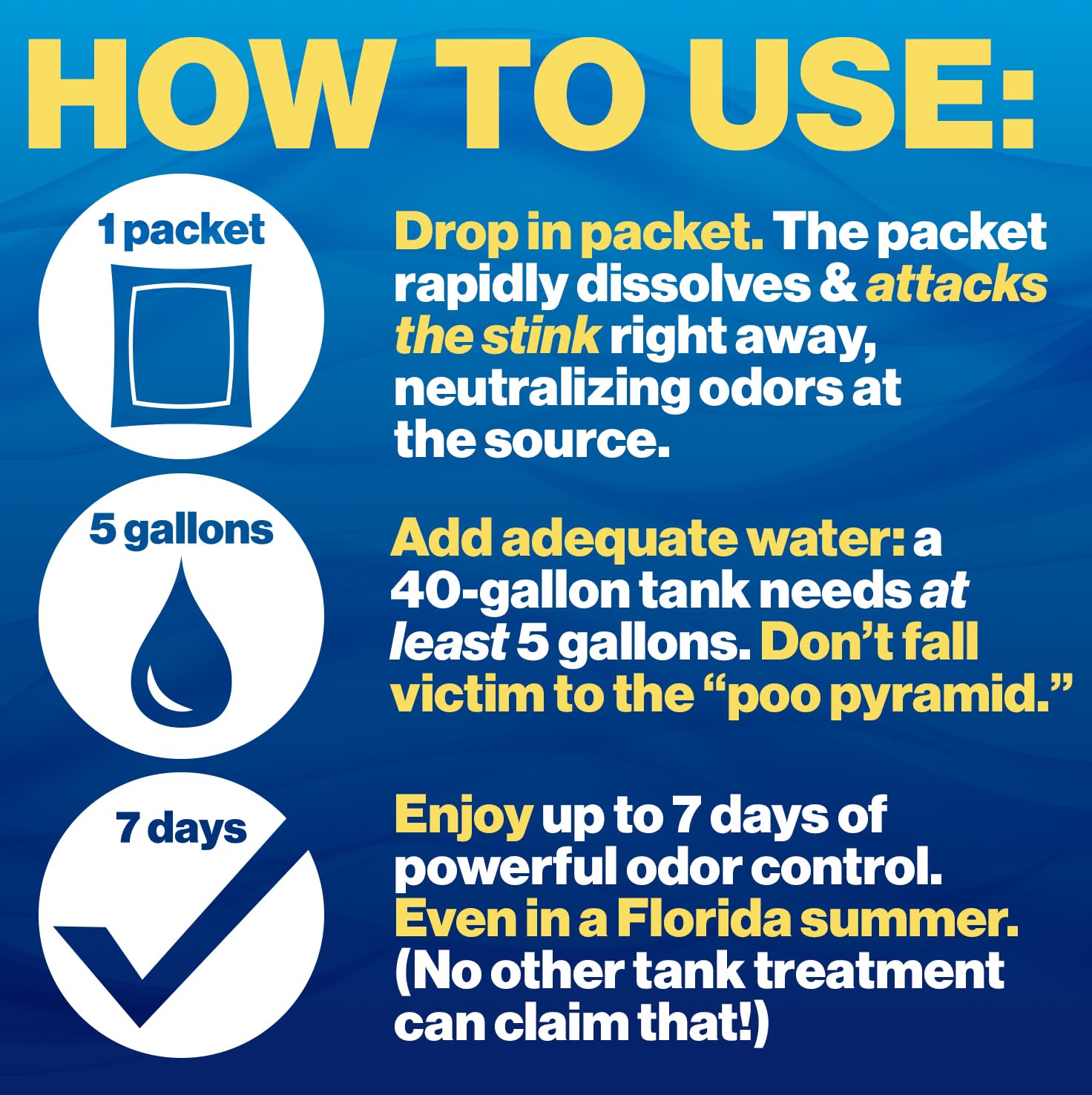 WASTE BREAKDOWN - Porta-Pak RV Marine Holding Tank Deodorizer breaks down waste and stubborn RV toilet paper, keeping your holding tank sensors working effectively. No more clogs or backups.