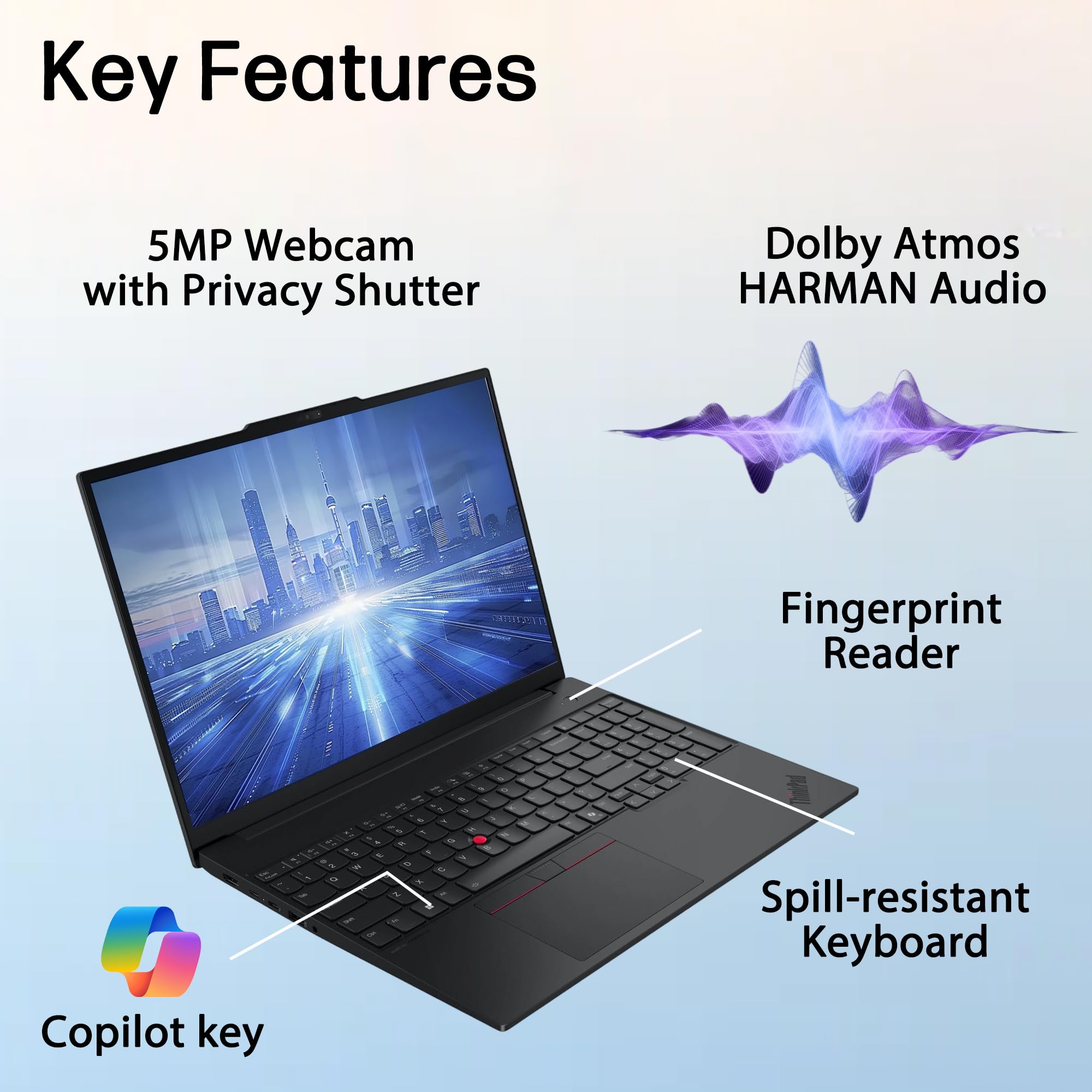 Processor: Intel Core Ultra 7 255H, 16C (6P + 8E + 2LPE) / 16T, Max Turbo up to 5.1GHz, 24MB NPU: Integrated Intel AI Boost, up to 13 TOPS Graphics: Integrated Intel Arc 140T GPU Functions as Intel Graphics Chipset: Intel SoC Platform Memory: 16GB DDR5 RAM Storage: 1TB PCIe NVMe M.2 SSD Audio Chip: High Definition (HD) Audio, Senary SN6141 codec Speakers: Stereo speakers, 2W x2, Dolby Atmos, audio by HARMAN Camera: FHD 1080p + IR Hybrid with Privacy Shutter Microphone: 2x, Array Power Adapter: 65W USB-C (3-pin) Display: 16" WUXGA (1920x1200) IPS 300nits Anti-glare, Non-Touch, 45% NTSC Keyboard: Backlit, English Dimensions (WxDxH): 14.01 x 9.80 x 0.40/0.67 (front/rear), 0.83 (maximum) inches Weight: Starting at 1.63 kg (3.59 lbs) Operating System: Windows 11 Professional Ethernet: 100/1000M (RJ-45) WLAN + Bluetooth: Intel Wi-Fi 6E AX211 2x2 AX; Bluetooth 5.3 Ports: 1x USB-A (USB 5Gbps / USB 3.2 Gen 1) 1x USB-A (USB 10Gbps / USB 3.2 Gen 2), Always On 1x USB-C (USB 20Gbps / USB 3.2 Gen 2x2), with USB PD 3.1 and DisplayPort 1.4 1x USB-C (Thunderbolt 4 / USB4 40Gbps), with USB PD 3.1 and DisplayPort 2.1 1x HDMI 2.1, up to 4K/60Hz 1x Headphone / microphone combo jack (3.5mm) 1x Ethernet (RJ-45) Kensington Security Slot Security Chip: Firmware TPM 2.0 Enabled Fingerprint Reader: Touch Style, Match-on-Chip, Integrated in Power Button Physical Locks: Kensington Nano Security Slot, 2.5 x 6 mm