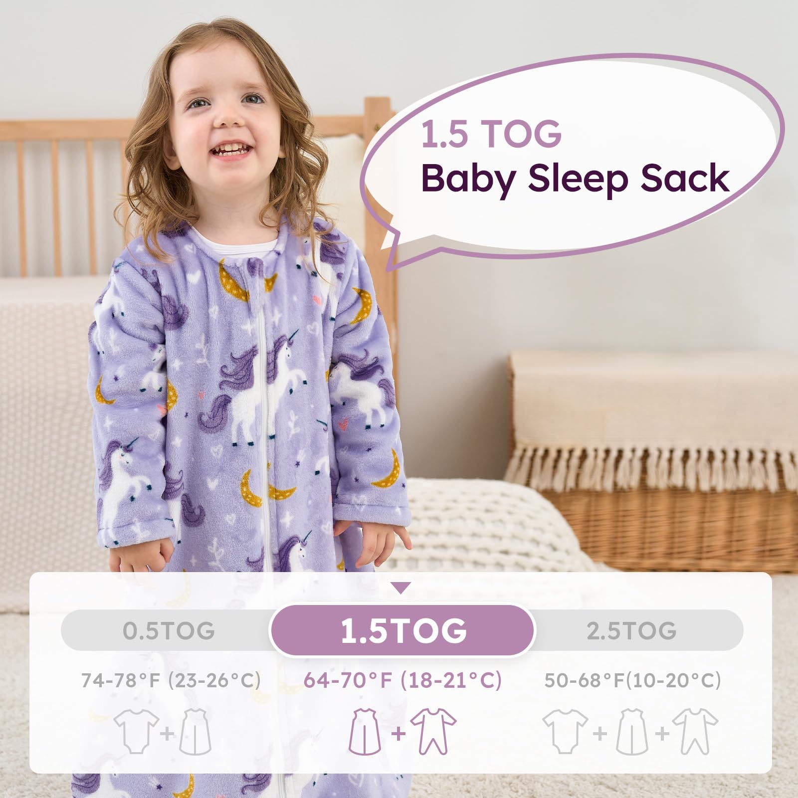 1.5 Tog Sleep Sack with Sleeves: Long sleeve design offers freely arm movement and warmth. 1.5 Tog sleep sack with sleeves is suiable for moderate temperatures from 69 to 73°F as an ideal option for autumn, early winter and spring or taking a nap in cool summer A/C room during the summer.