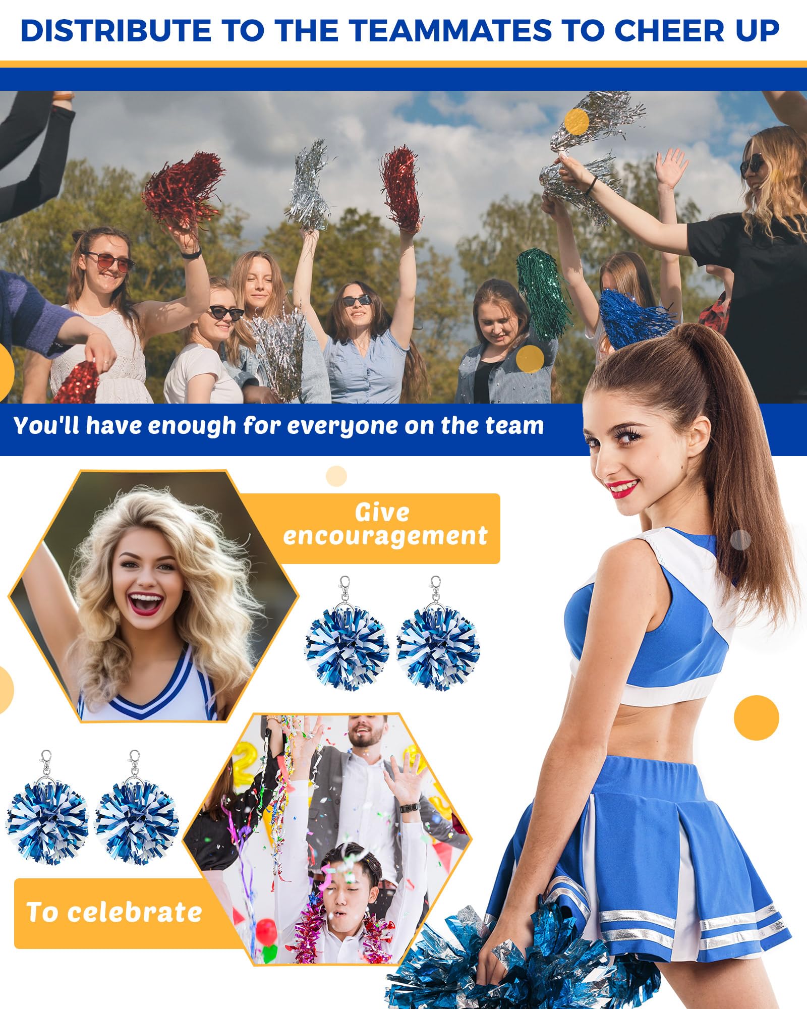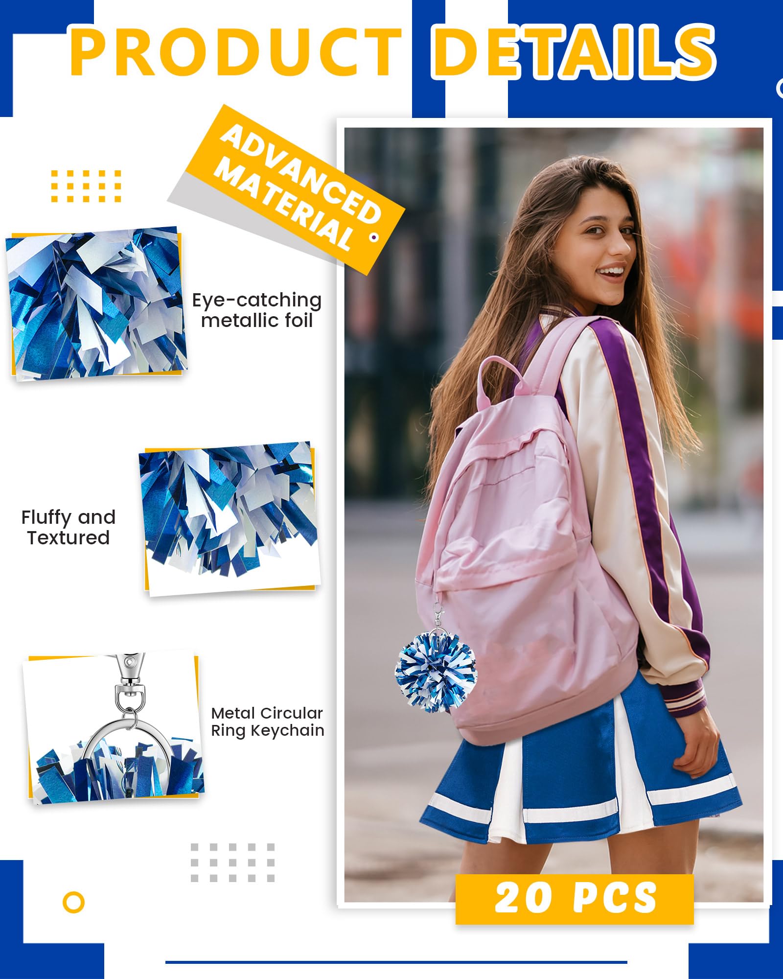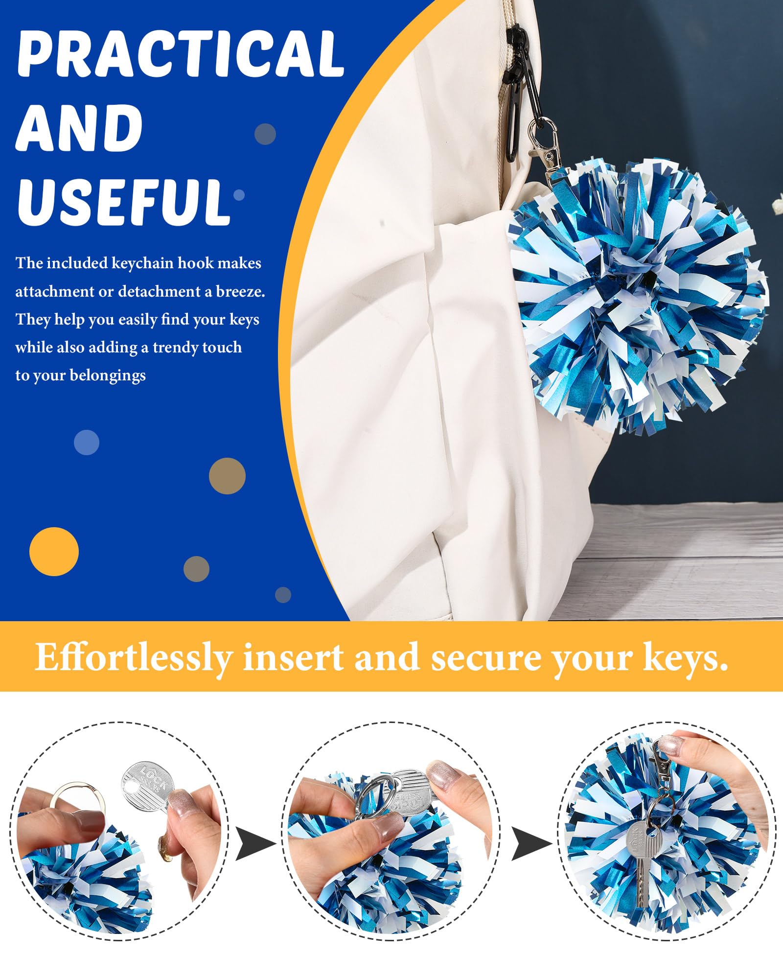 Sturdy Material and Vibrant Colors: these pom pom keychains are made of quality plastic and metal for durability, and feature nonfading, shimmering blue and white foil; They catch the eye, boost cheerleading spirit, and show your strong support for the team