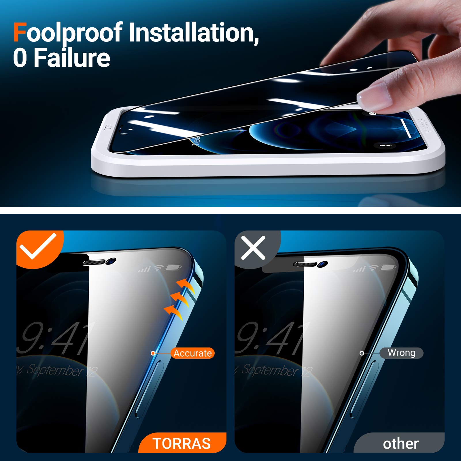 ANTI-SHATTERPROOF&ANTI-SCRATCH: TORRAS for iPhone 12 Pro Max tempered glass screen protector made of 9H super strong military explosion-proof glass, and the strengthened edge design ensure the corners of the screen are protected well. Your screen will be as new as day one, even if it falls from 6 Ft height