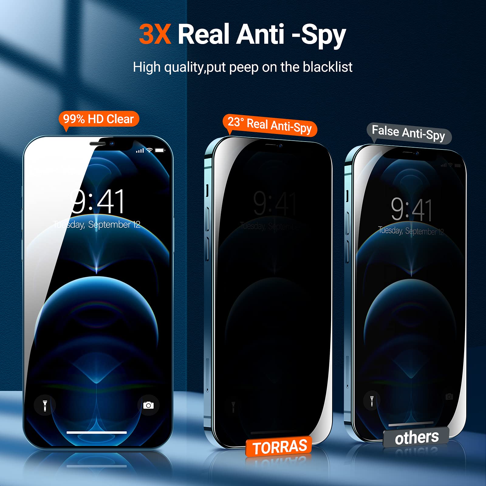 99.99% HIGH DEFINITION: TORRAS iPhone 12 Pro Max privacy glass screen protector break through the defects of the blurred picture of the privacy glass films on the market, highly restore the best visual feast brought by the iPhone screen. Anti-fingerprint, anti-smudge(Note: This protector has a special anti-peek coating, so turn up the display lightness will bring a better view experience)