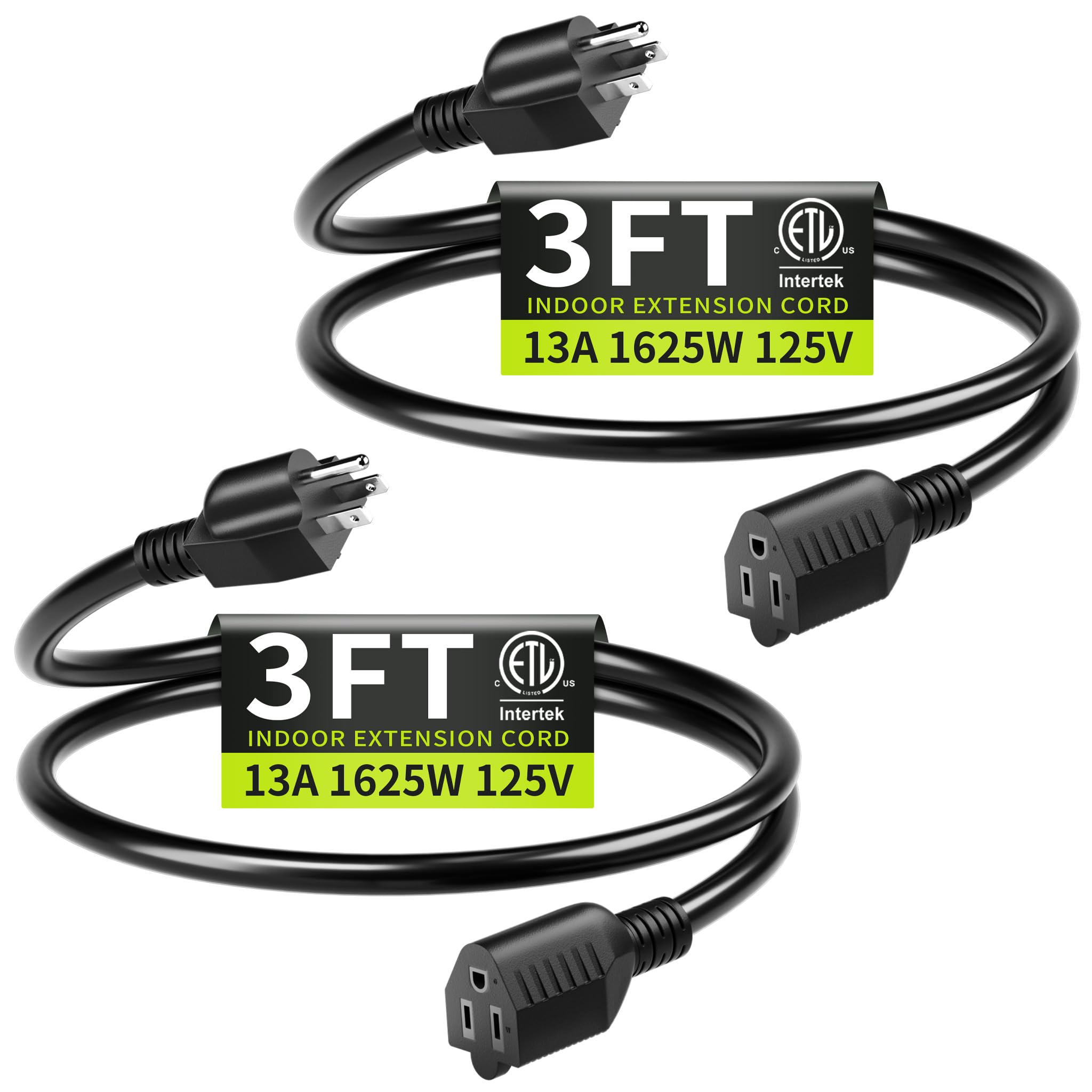 ETL Listed and Trusted: 6 ft 2 pack extension cord rated 13 Amps, 1625 Watts and 125 VAC; Male NEMA 5-15P and female NEMA 5-15R; It is ETL/cETL Listed; Ensuring its compliance with strict safety standards; Each black extension cord 6ft passes a 1500V high voltage test before leaving the factory to ensure safety; Reliability and efficiency indoor extension cord are capable of meeting most electrical needs