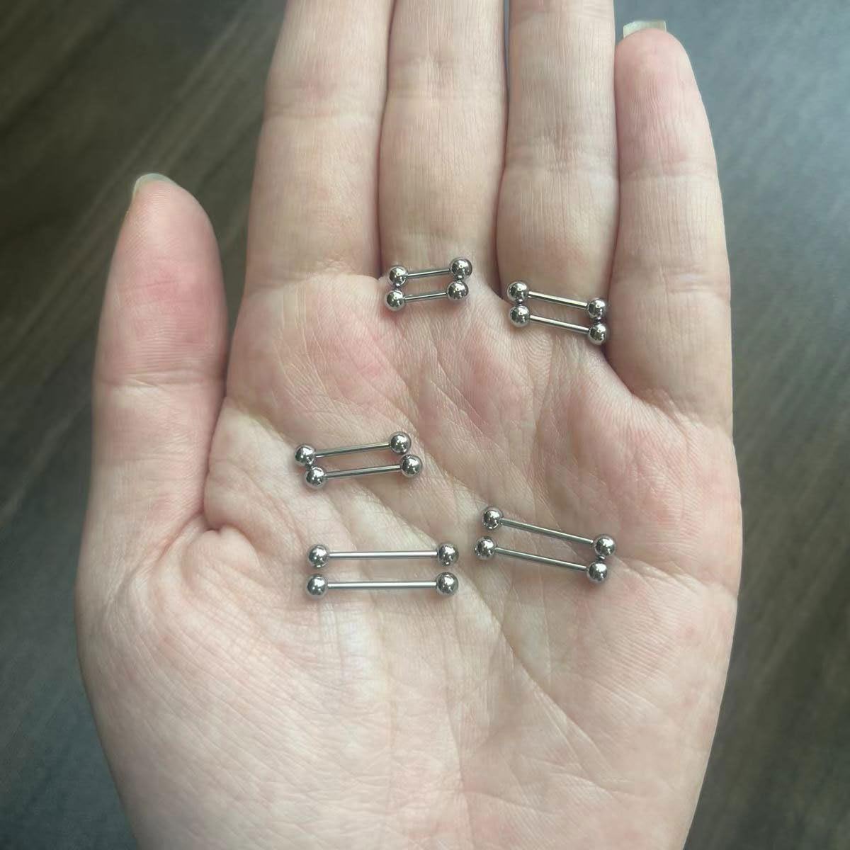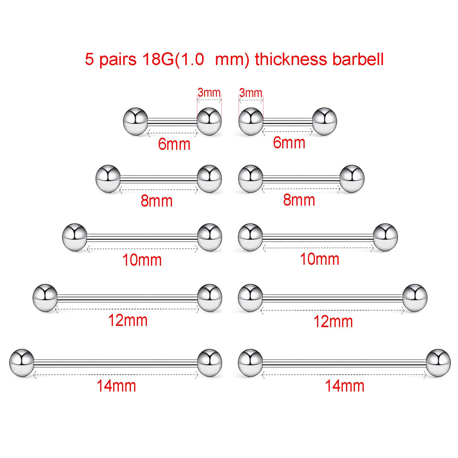 【DIMENSION】: 18G(1.0mm) bar thickness,Multiple bar length: 6mm,8mm,10mm,12mm and 14mm,5 different length. Beads: Φ3mm.Each size one pair.Each package contain 5 pairs.