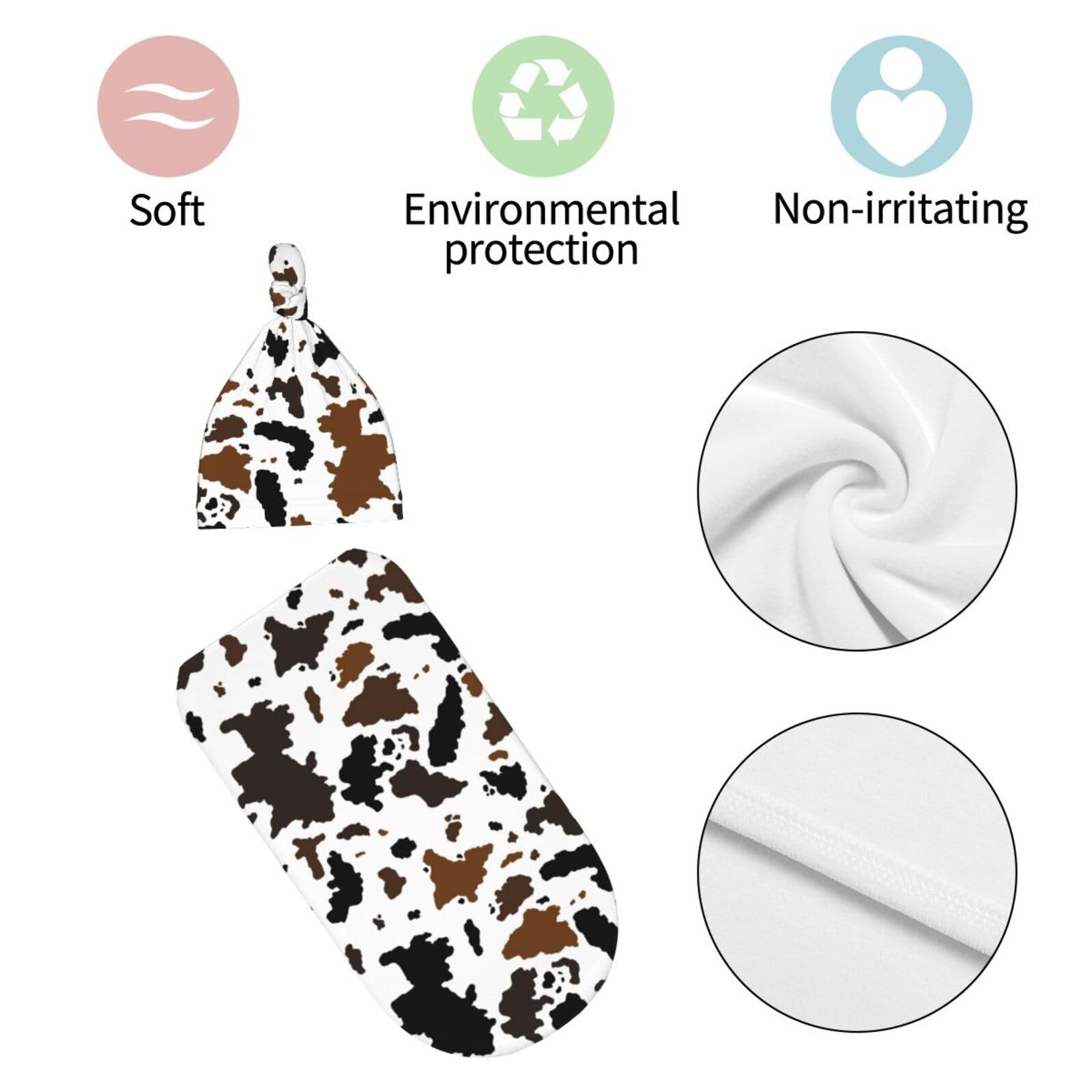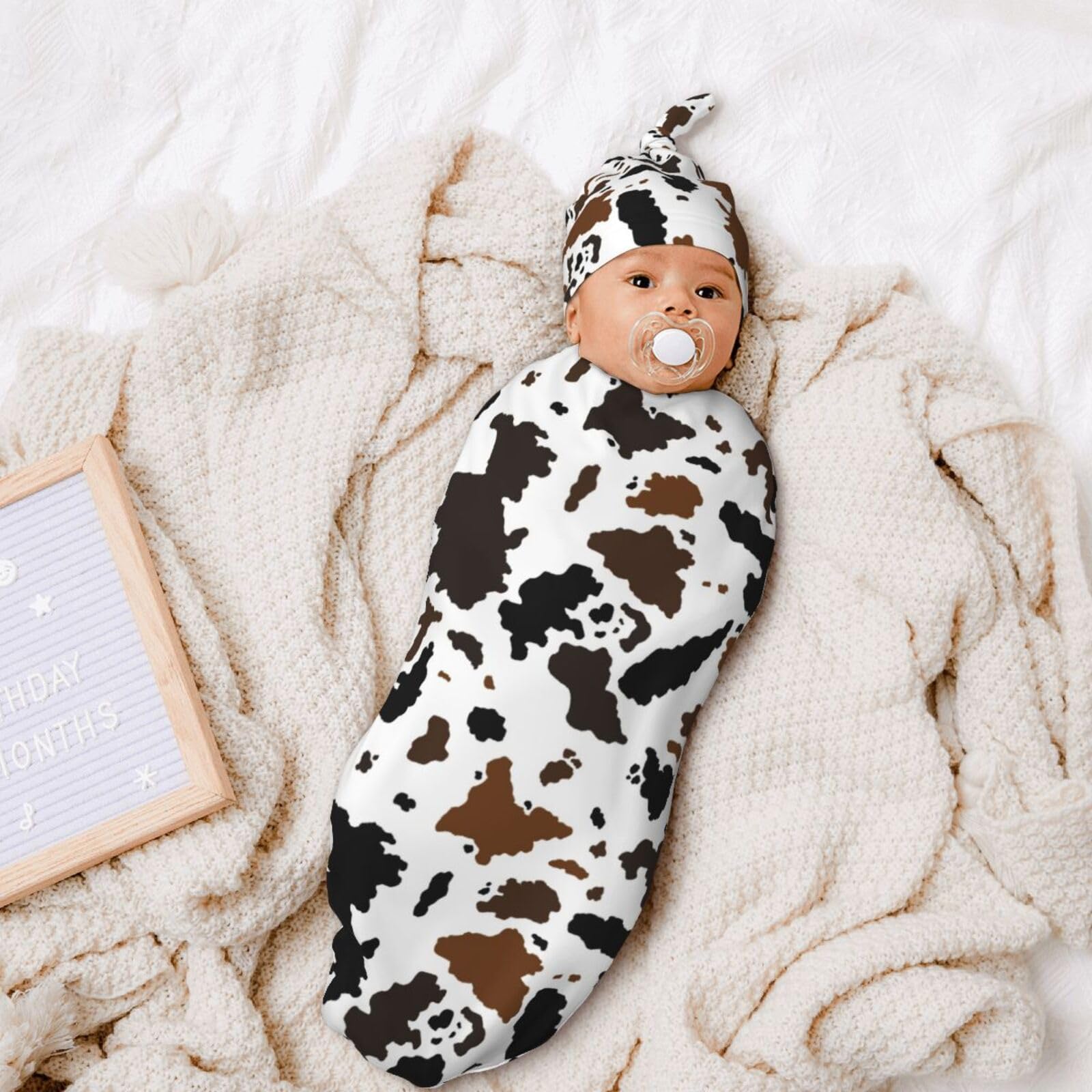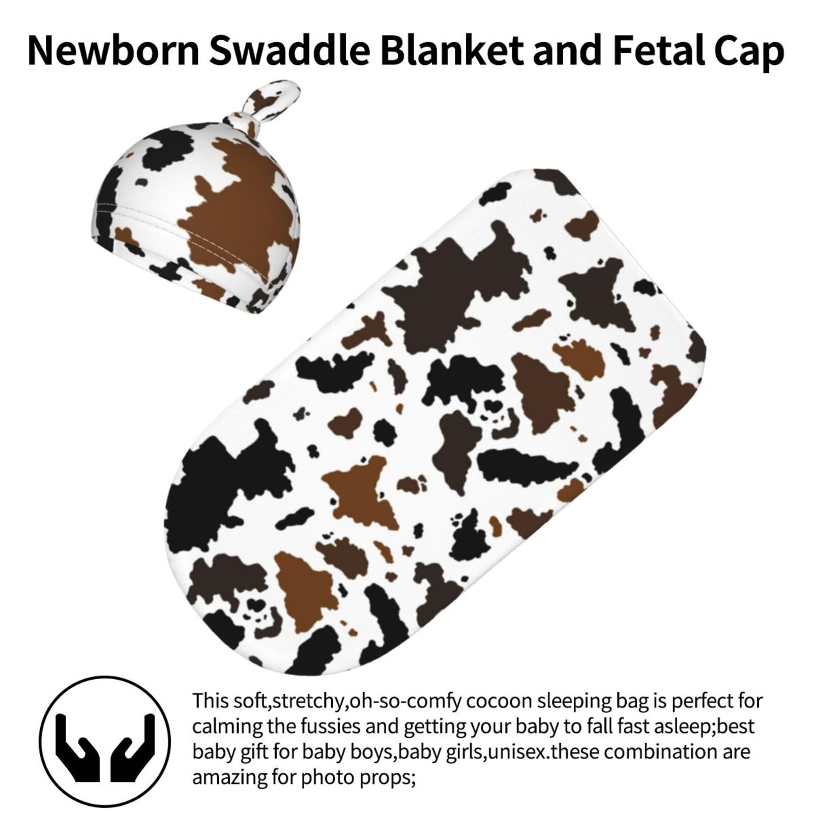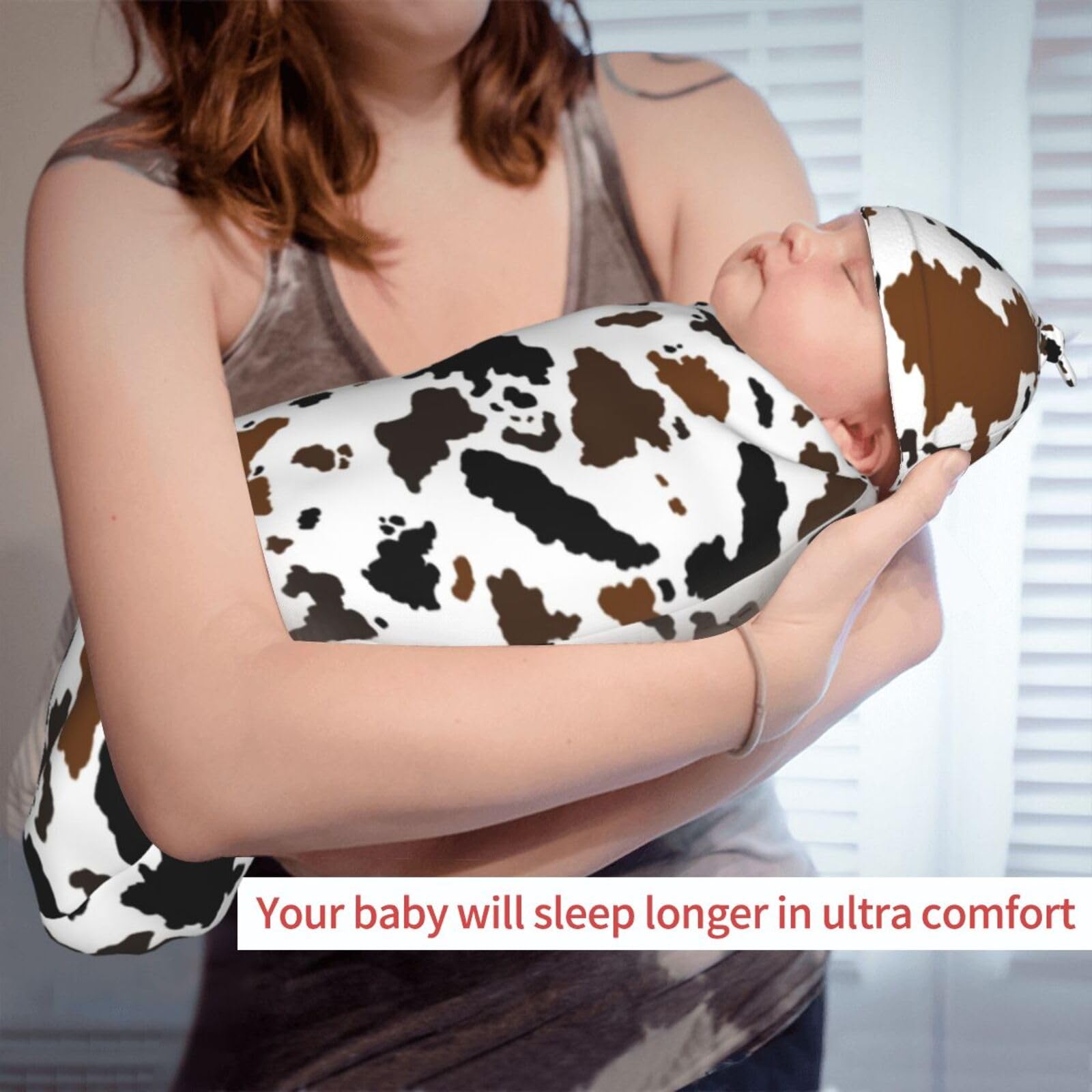 Brown Cow Print Baby Stuff Newborn Swaddle Blanket Beanie Hat Set, Soft and Stretchy Cow Print Baby Blanket Swaddle Sack Gift for Boy and Girl Highland Cow