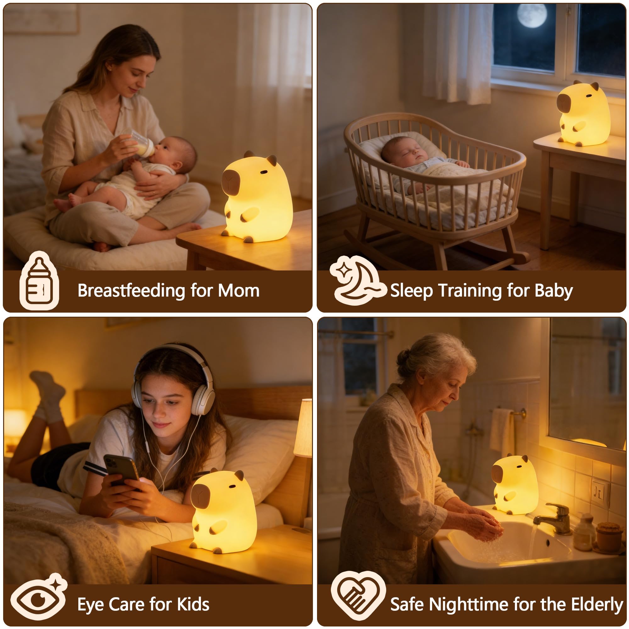 Perfect for Everyone Cordless Design Portable Rechargeable Night Light - This LED Squishy Animal Night Light suits kids and adults alike! Creates instant cozy ambiance with ultra-soft lighting - perfect for bedtime routines, or anxiety relief.Gentle glow helping nursing moms during midnight feedings & diaper changes,Guides seniors safely at night ,Soothes kids to sleep.Helps dads work late & students study,Cute dorm decor for college girls.Adorable nursery decor & practical capybara toys.