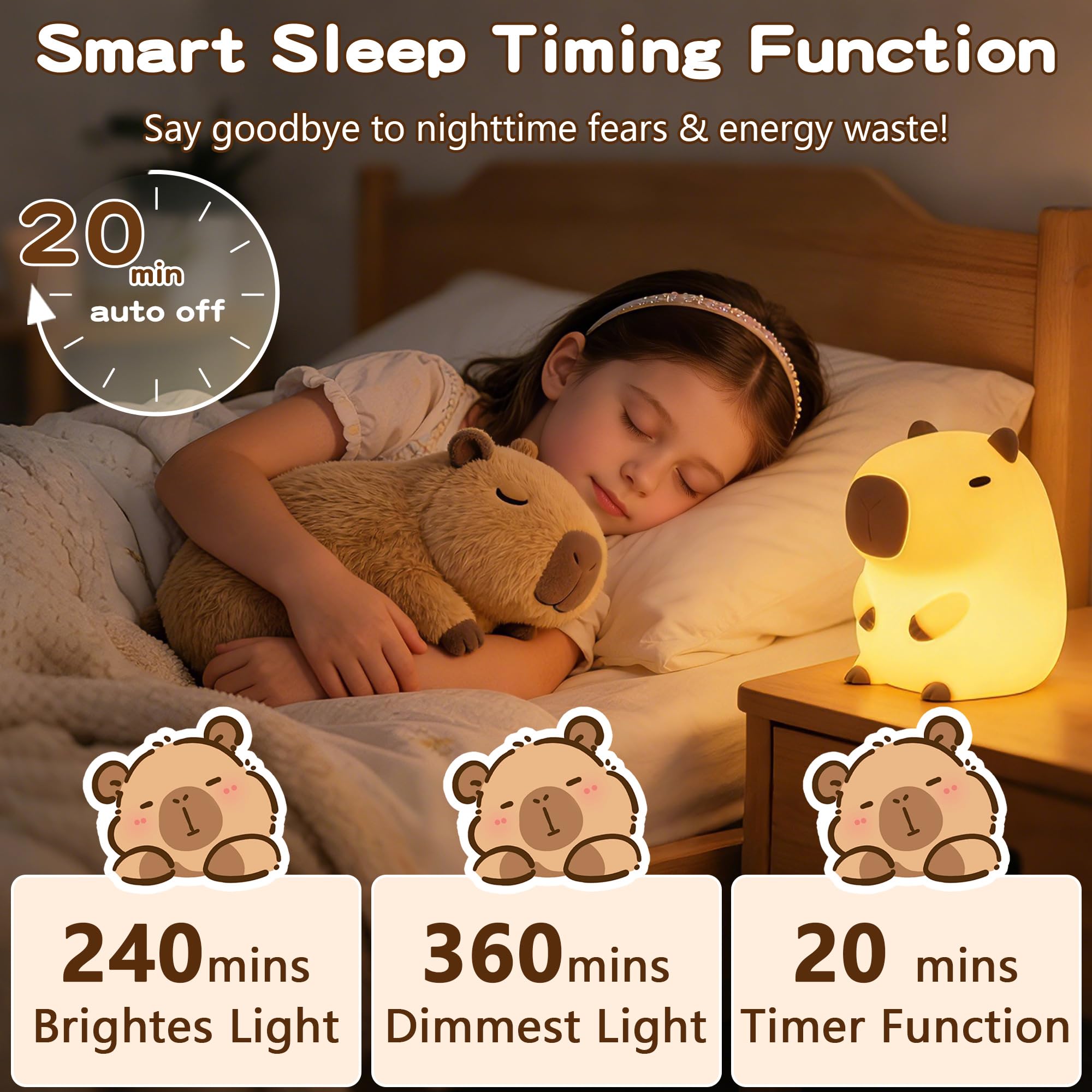 2-Levels Dimmable & 20Mins Auto-Off Timer - Smart Nursery Night Light : Tap or pinch this capybara lamp to adjust brightness (soft glow or brighter light) and choose between Always On or 20-minute Timer Off modes. Saves energy, perfect for nurseries, hallways, or helping kids sleep.Cord-Free,Hassle-free USB-C rechargeable – no batteries needed, Plug-and-play simplicity.