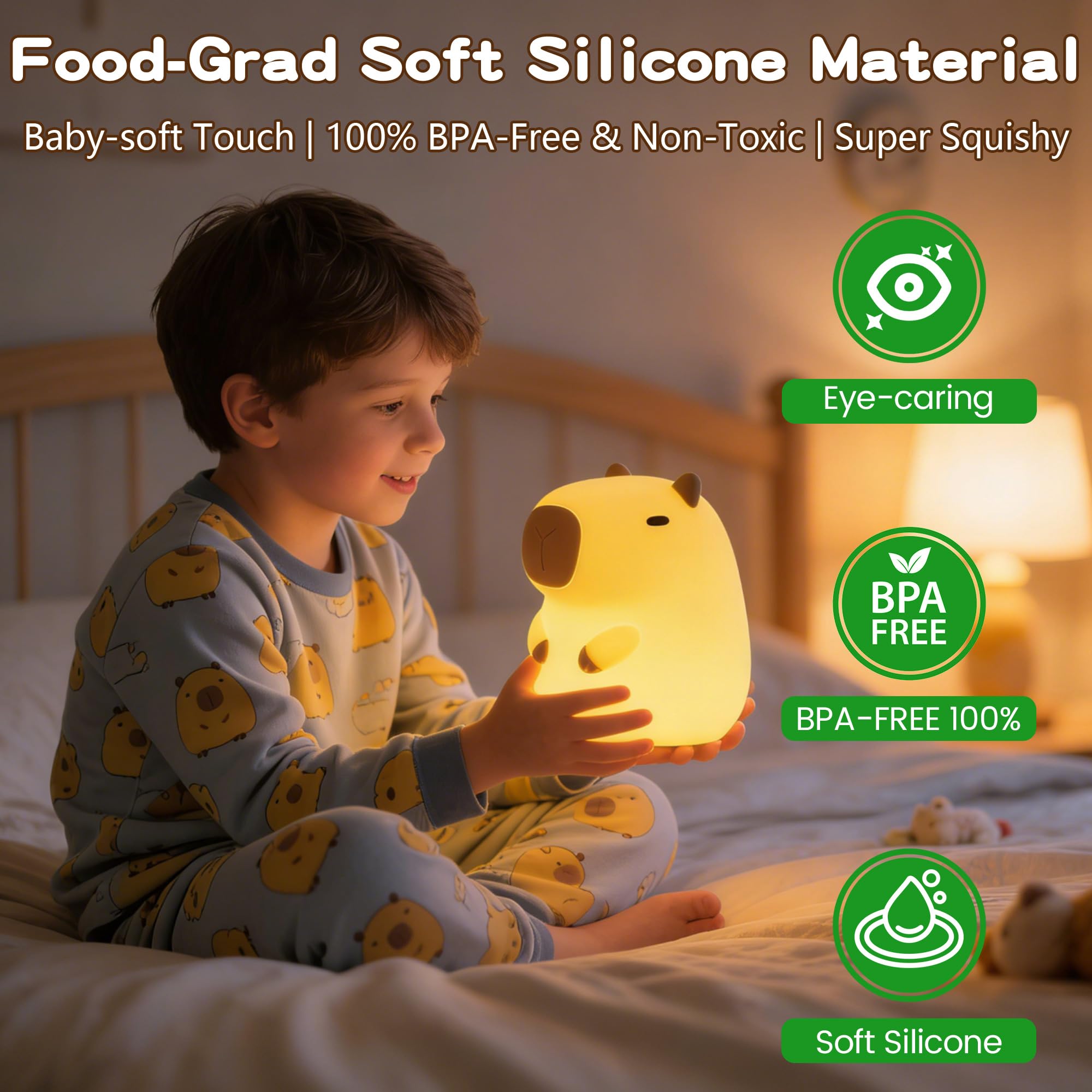 100% Safe & Soothing Night Light for Kids - this capybara nightlight is made of non-toxic ,BPA-free,child-safe, squishy silicone (food-grad soft silicone material ) 3000K warm light, eye caring and perfect for bedtime. Anti-blue LED technology ensures no flickering. A must-have for nurseries, feeding, changing diapers , nighttime safety.