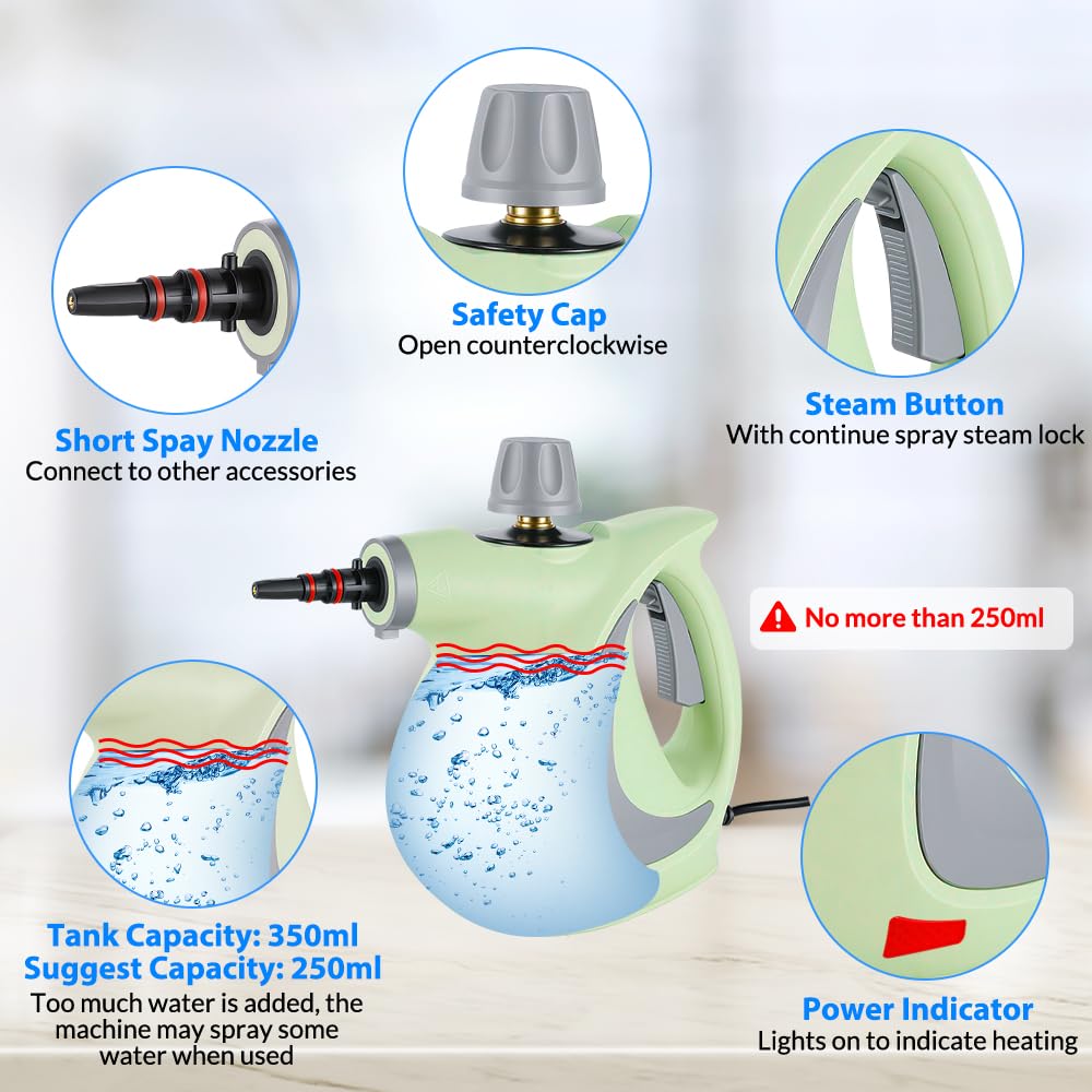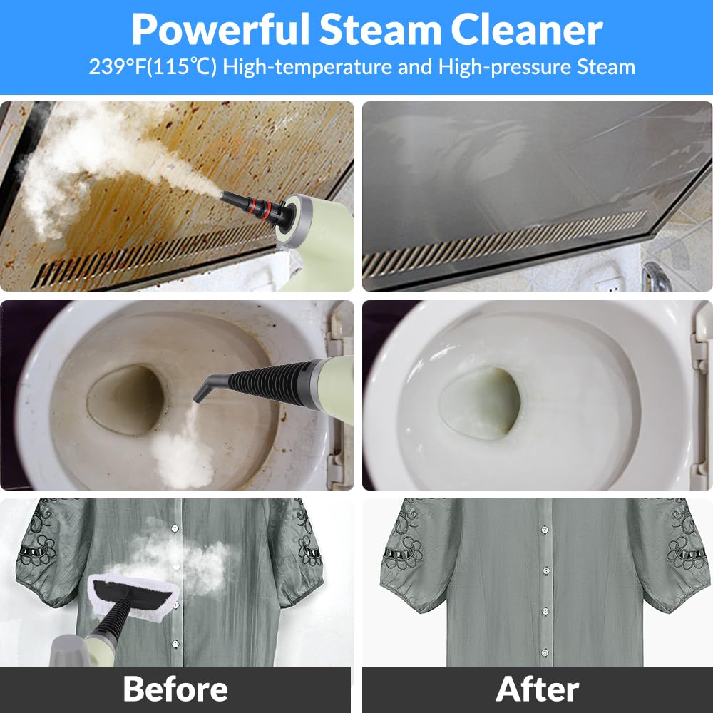 Powerful Steam Cleaner: With 1050 watts of steam power, can heat up in 3-5 minutes fast to emit 239 ℉(115 ℃) of pressurized powerful hot steam, it is great for cleaning all kinds of grease, dust and stains