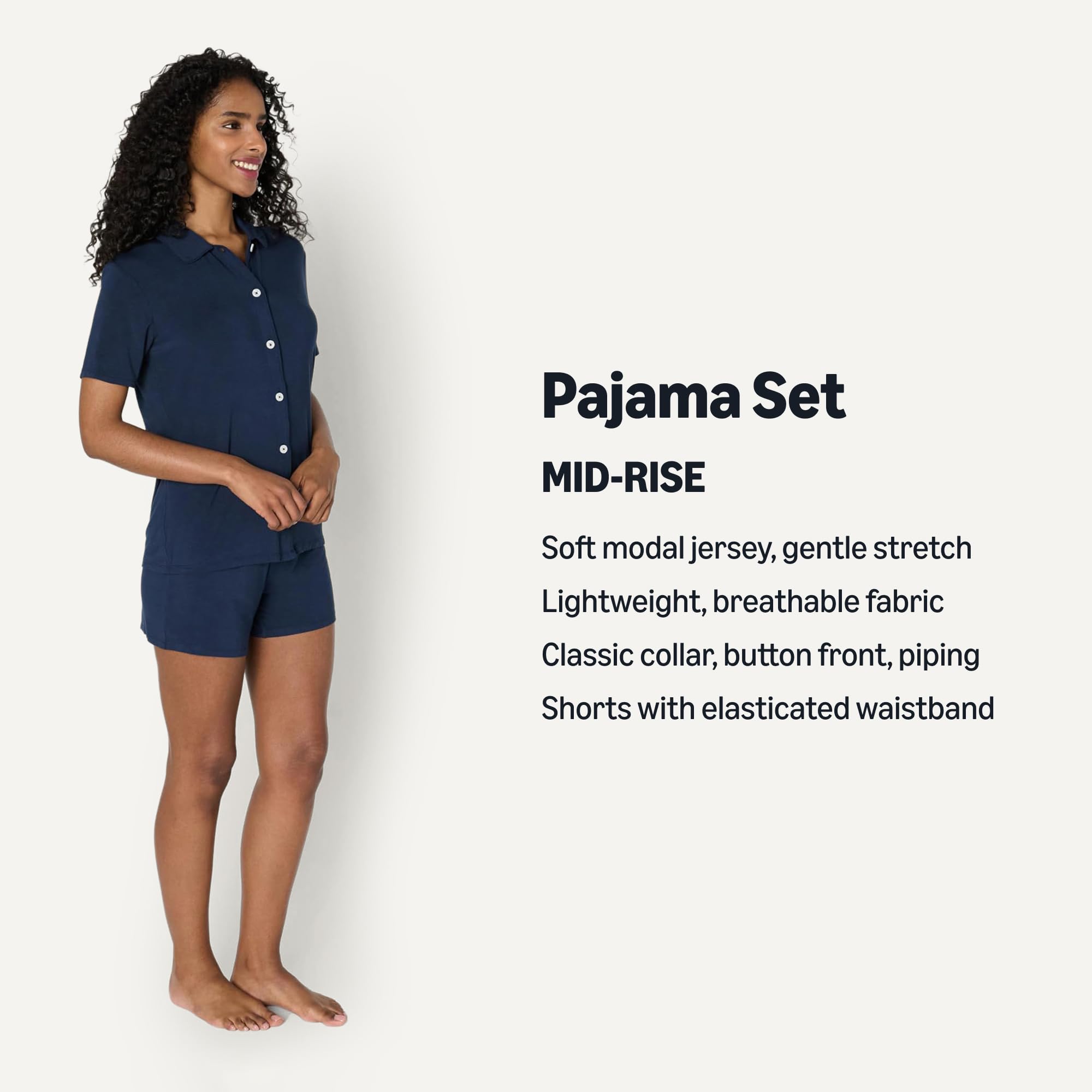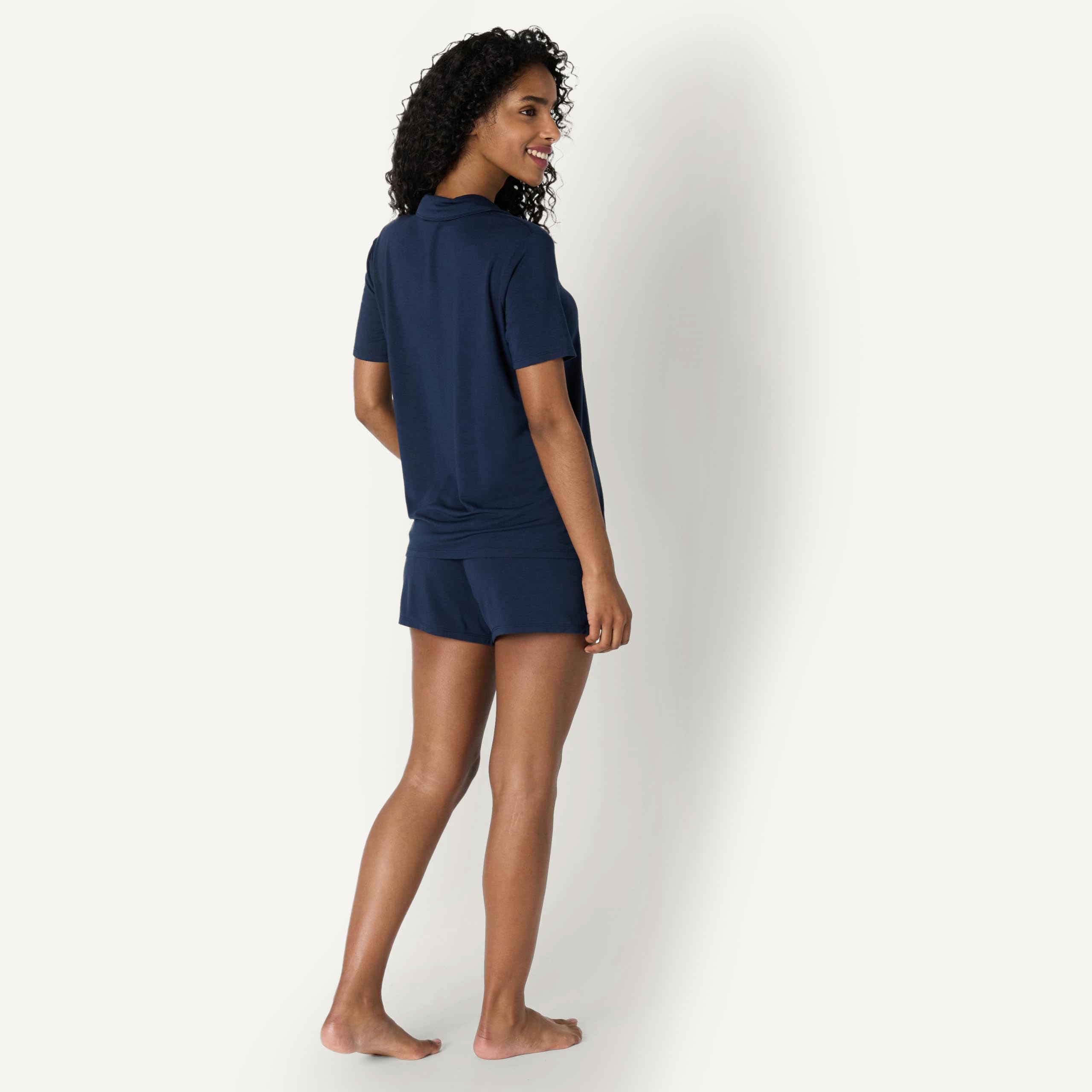 DETAILS: This set includes a button-front, short-sleeve top with a classic shirt collar and delicate piping at the front opening and collar. The shorts feature an elasticated waistband for a comfortable fit