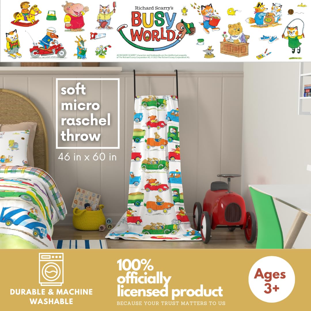 RICHARD SCARRY DESIGN: Wrap up in whimsical adventure with this Richard Scarry throw! Featuring a vibrant design of beloved characters and fun transportation vehicles on a crisp white background, this throw brings the charm of Richard Scarry’s world to life. Soft, cozy, and perfect for little ones who love to explore, it’s a delightful addition to any room.