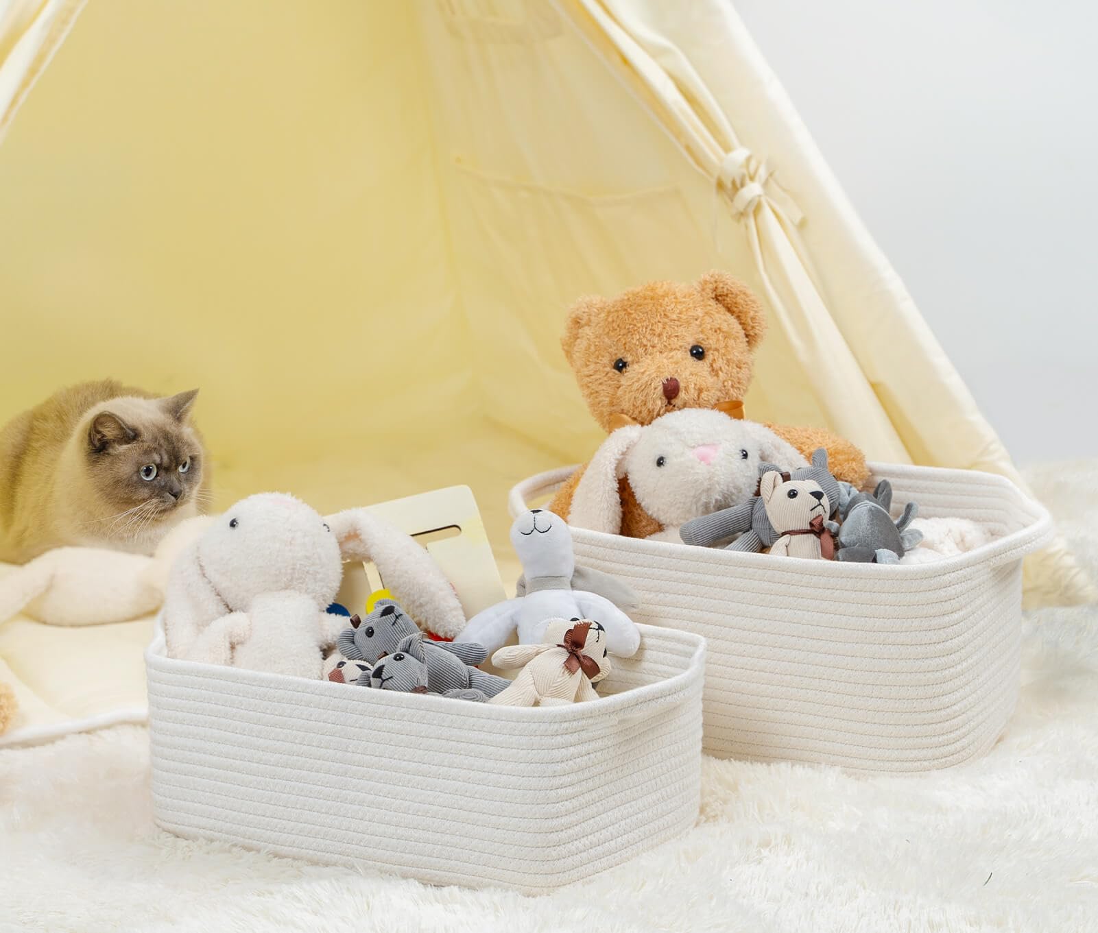 Rectangular Basket. The size of woven rope basket is 14 x 10 x 5Inches. Great storage solutions for your laundry room, closet, shelves, entryway, playroom and so on. It also can be used for nursery room as baby baskets or small toy baskets, making your home clean and tidy