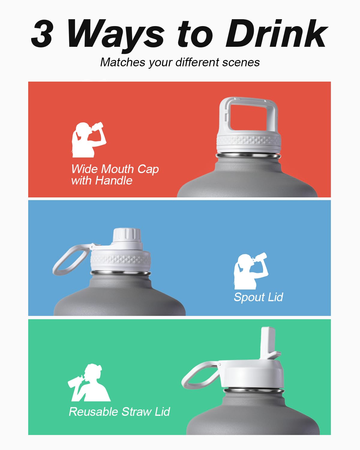 Flexible Drinking On-the-Go: This half gallon water jug comes with 3 different lids. The screw-on lid with flip-up handle is for easy ice refilling with superior portability; spout lid makes it convenient to drink hot liquid and straw lid for sipping cold