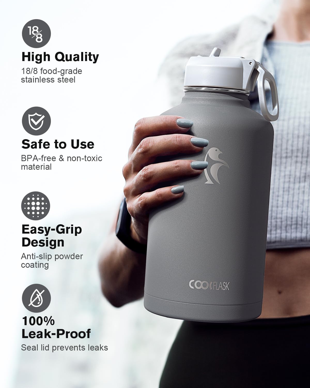 Half Gallon Water Bottle Insulated with Straw & 3 Lids, Coolflask 64 oz Water Jug Large Metal Stainless Steel Wide Mouth for Sports, Gym or Office, Non-BPA Keep Cold 48H Hot 24H, Dark Grey