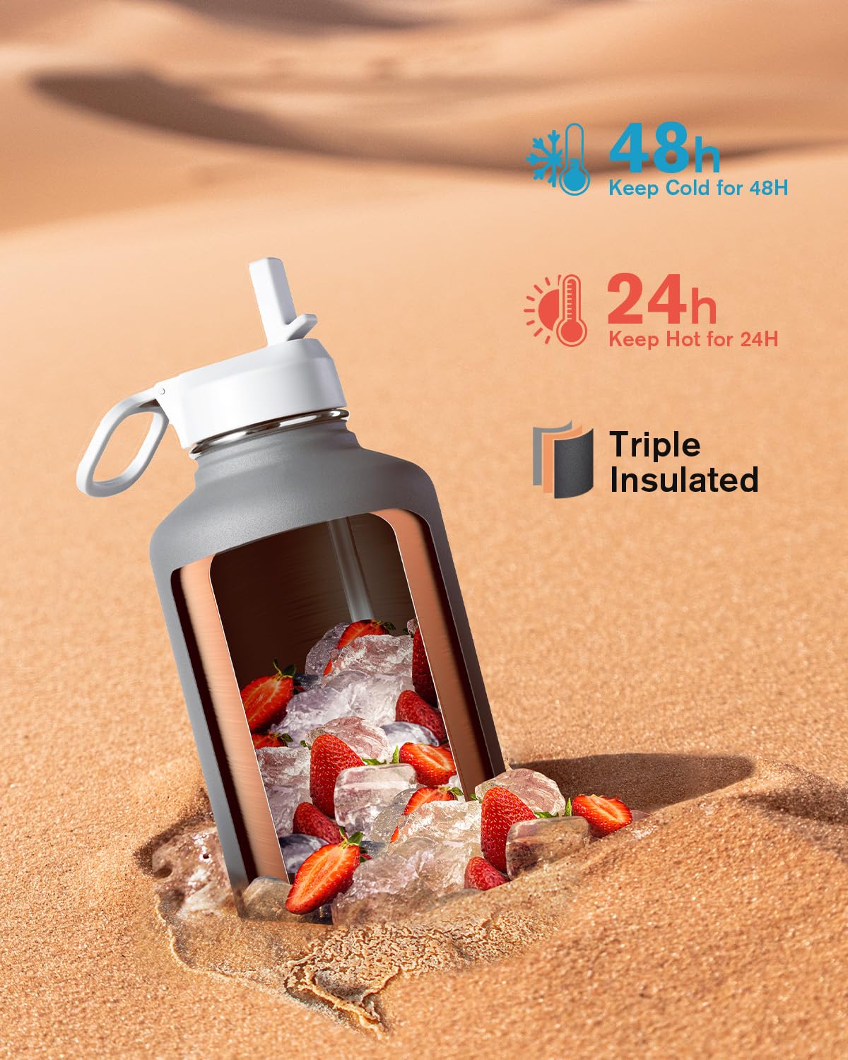 48H Cold & 24H Hot: Triple Insulation Technology adopts double wall and vacuum seal, keeps beverages cold for up to 48 hours and hot 24 hours. Anti-sweat coating can keep the surface dry and clean, making it easy to grip