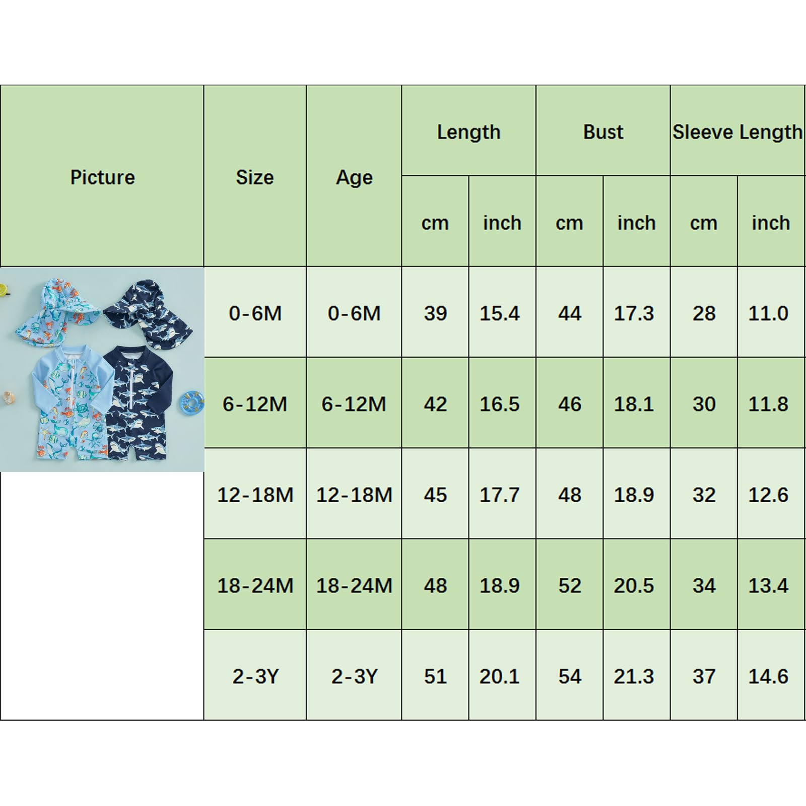 Description Baby/Toddler Boy Rash Guard Swimsuit Long Sleeve One Piece Zipper Swimwear Sunsuit Infant Bathing Suit Beachwear Specification: Condition: 100% Brand New Material: 82% Polyester+18% Elastane Style: Fashion Gender: Boys Season: Summer Pattern: Dinosaur/Marine Animal Print Occasion: Swimming, Surfing, Beach Package Including:1 x Swimsuit for baby boy+ 1 x Hat/NO Note: 1.There may be 1-2 cm deviation in different sizes, locations and stretch of fabrics. 2.Size chart is for reference only; there may be a little difference with what you get. 3.Color may be lighter or darker due to the different PC display.