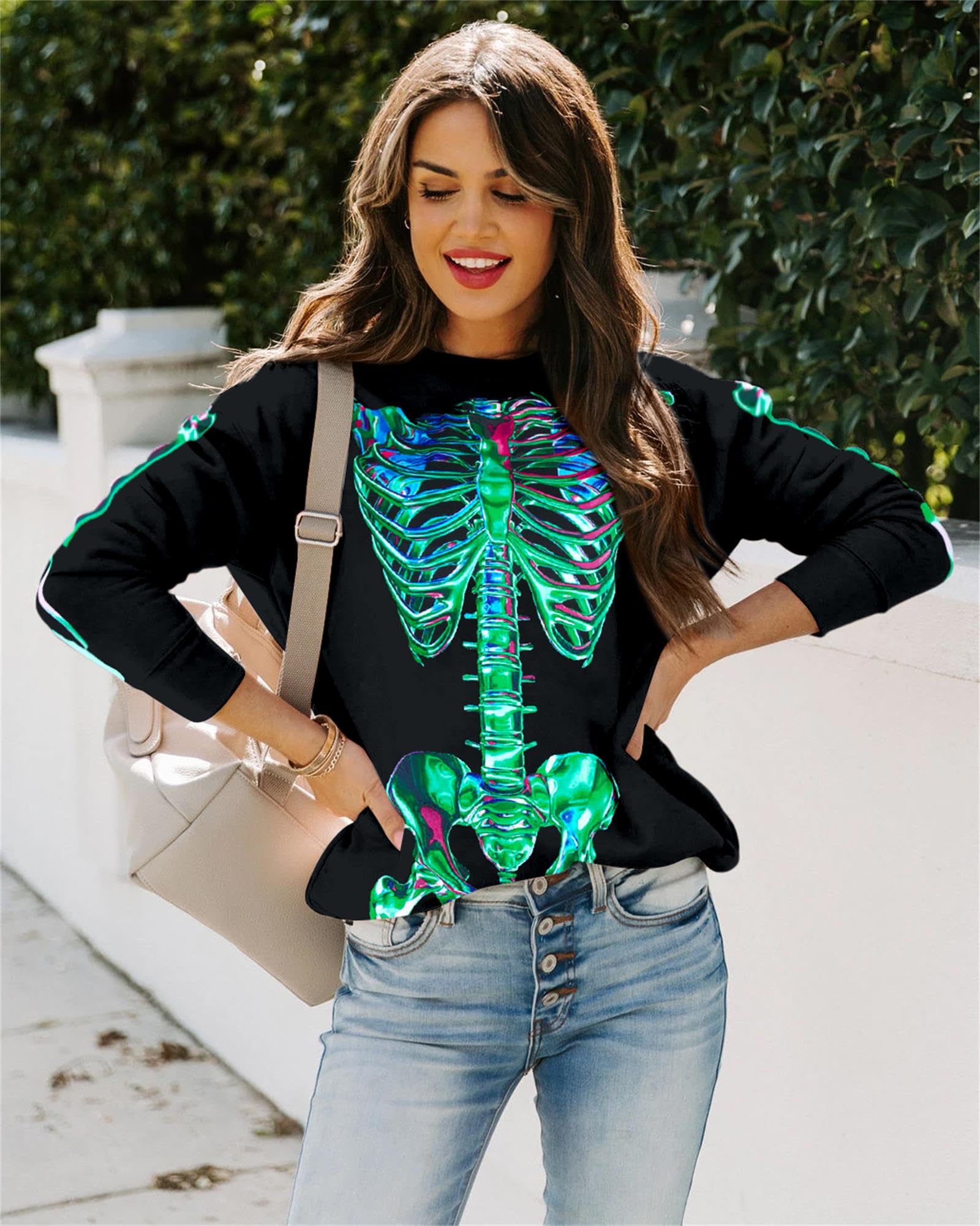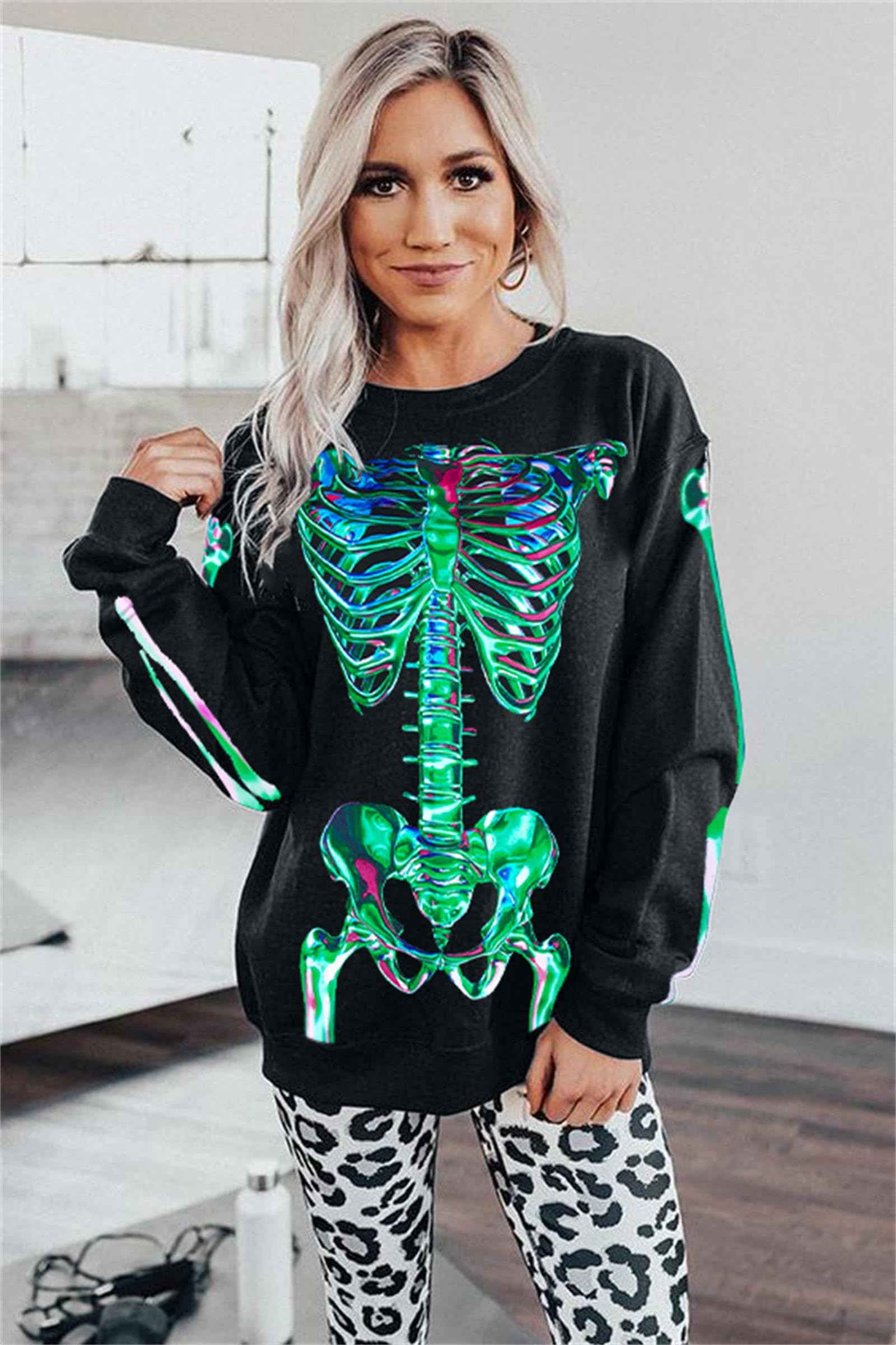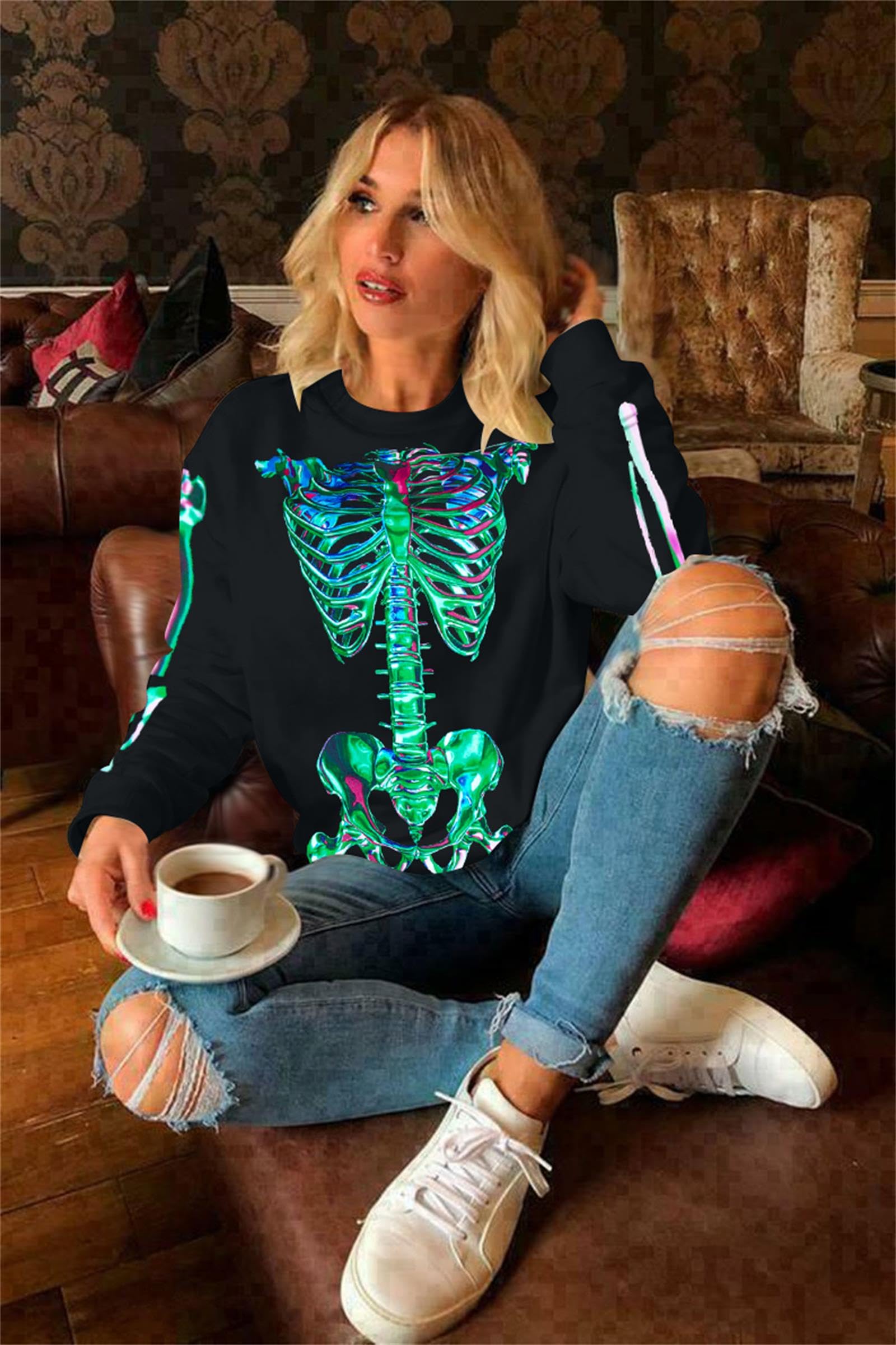 MATERIAL :The oversized gothic skeleton sweatshirts is made of soft cotton blend. This skull sweater for women shows off your curves perfectly. It's casual and comfortable,you will need them all over the year. S=US(4-6), M=US(8-10), L=US(12-14), XL=US(16-18), 2XL=US(20-22). Please refer to the size chart.