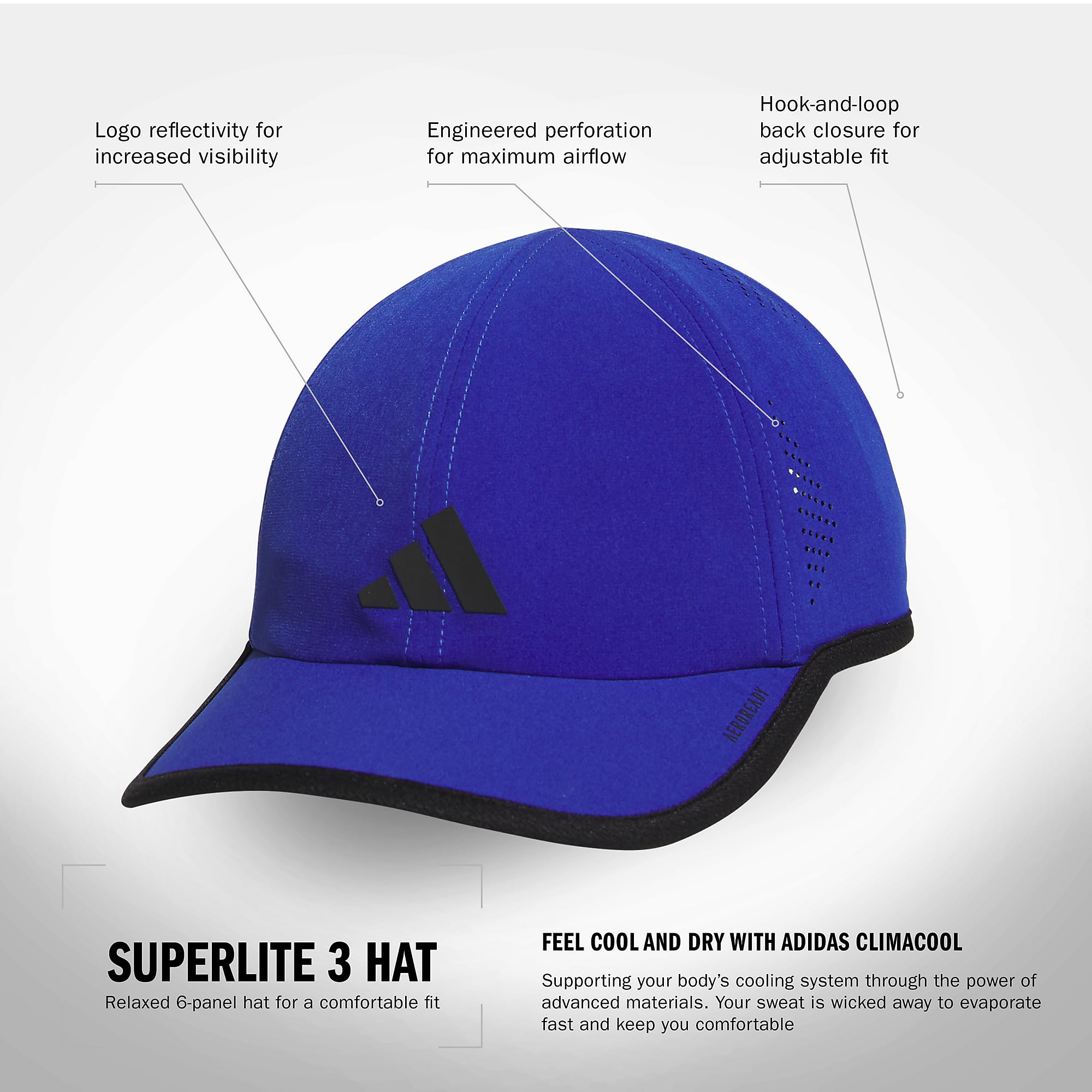 Description Designed with the active man in mind, this adidas Superlite hat for men offers both style and functionality. Crafted from recycled materials, these adidas men's caps are part of a conscious effort to maintain environmental responsibility while providing top-notch headwear. The lightweight 6-panel construction includes a premium 3D adidas logo, making it a standout addition to any wardrobe. Featuring mesh panels for airflow and moisture-wicking capabilities, this hat helps you stay cool and dry, whether you're training or relaxing. The non-glare lining under the visor enhances vision on sunlit days, and with UPF 50 sun protection, these caps shield against the sun’s most harmful rays. The adjustable hook-and-loop back closure offers a customizable fit, making sure the one-size design meets your comfort needs. Although the reflective elements add a sleek design touch, please note they are not intended for personal protective equipment use.