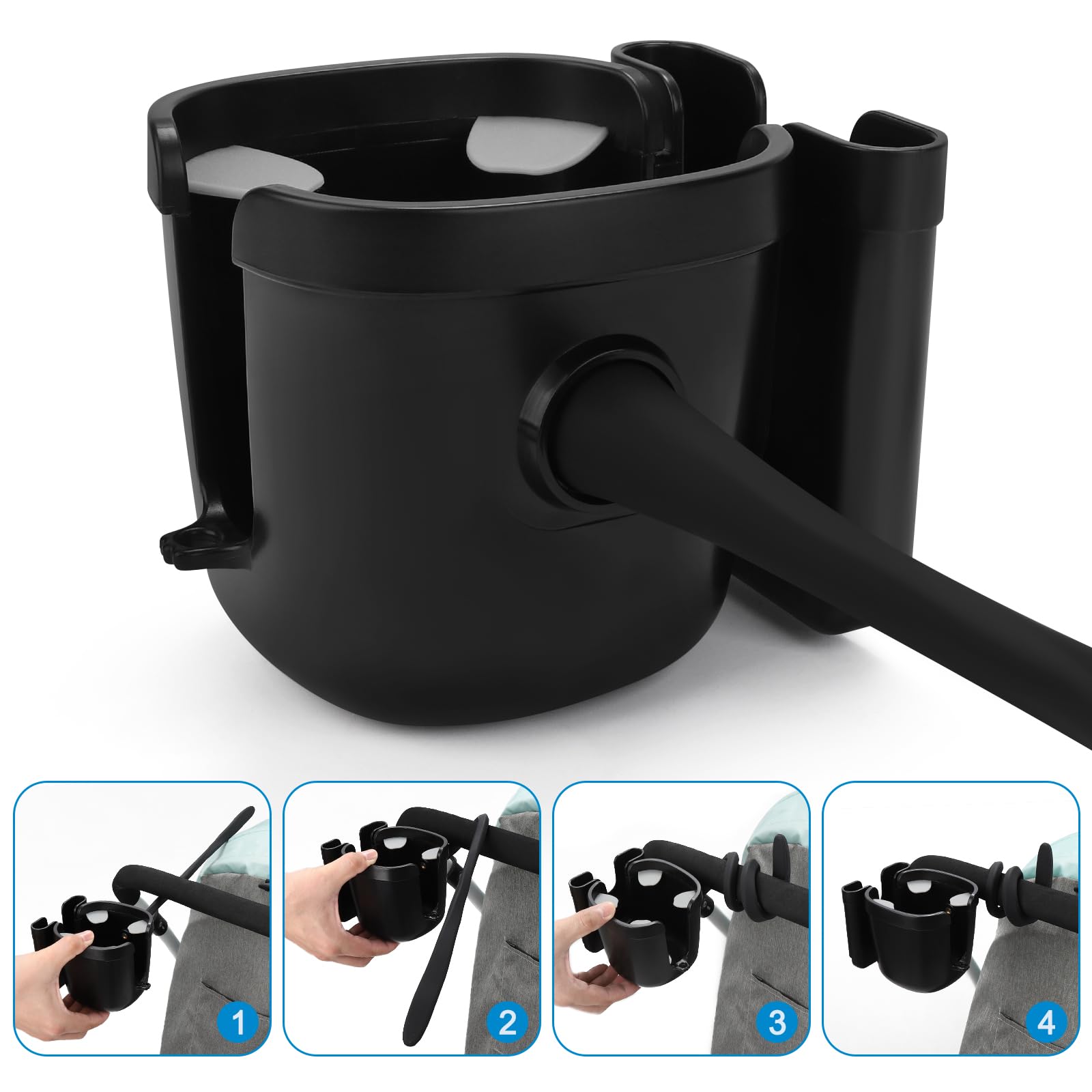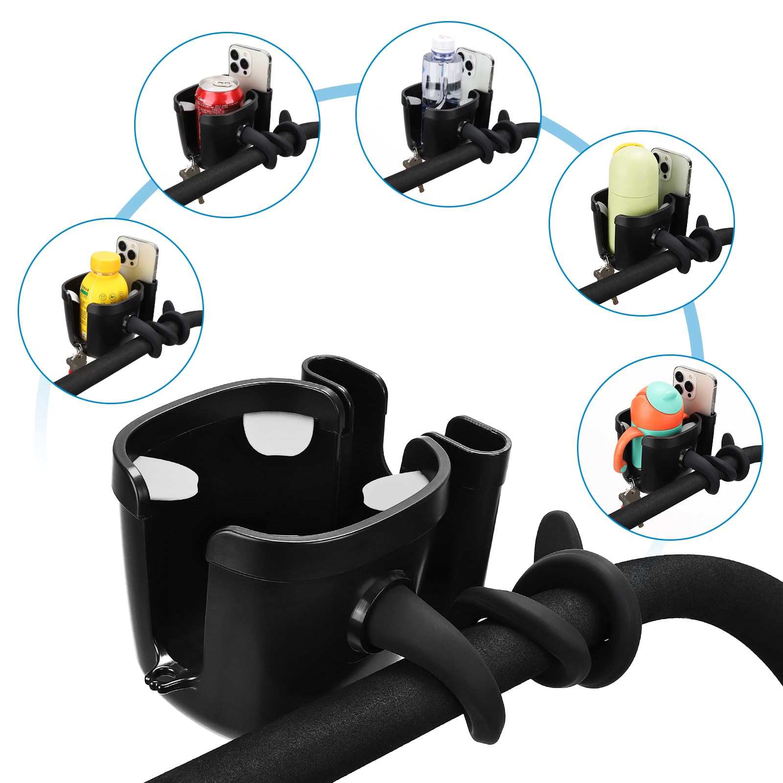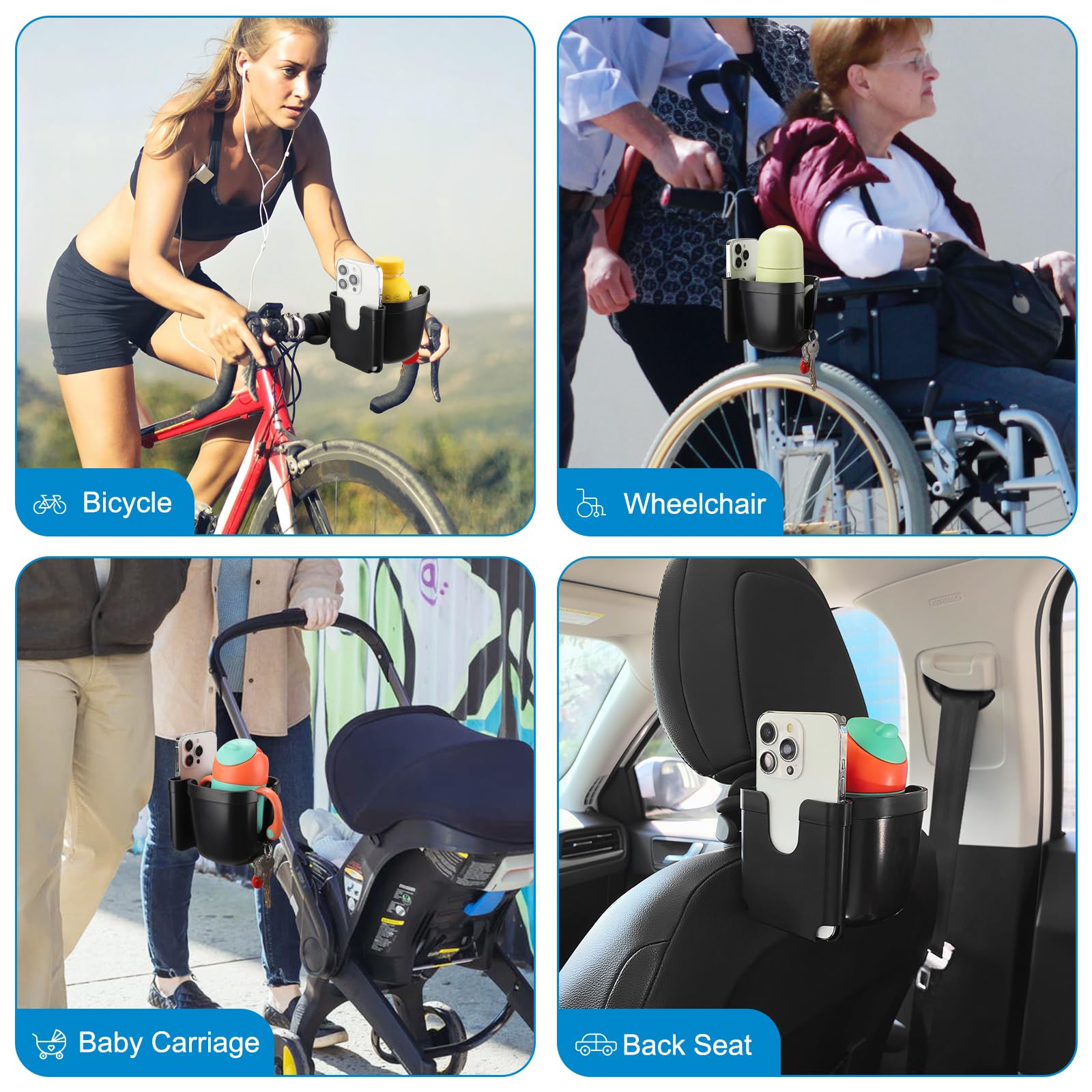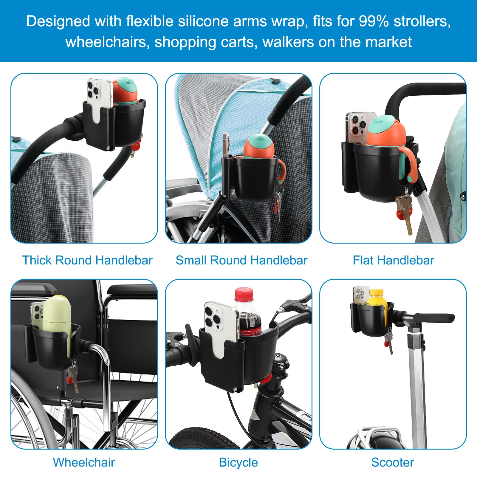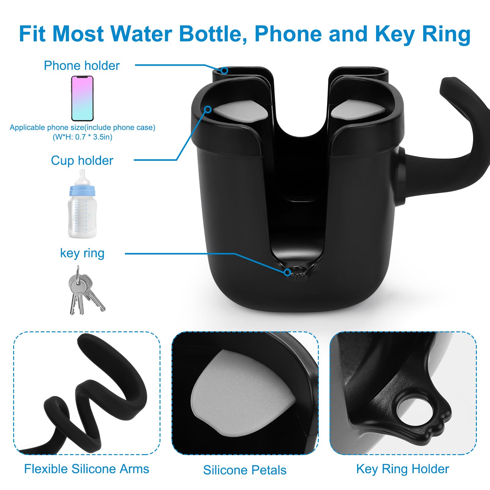 This 3-in-1 stroller cup holder with a phone holder and keys holder, it can load drink bottles, cell phone and your keys at the same time. Compatible with phones up to 6.8 inches in the market.