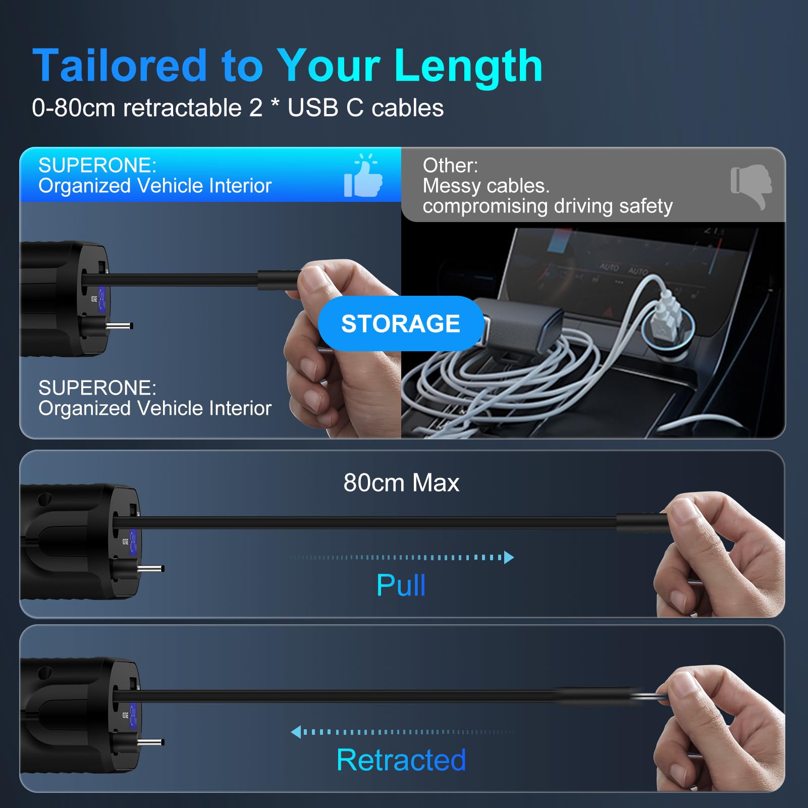 【Built-in Dual Pack of Retractable USB-C Cables】: The iphone 16 pro car retractable car charger features two 2.6FT (80cm) USB C retractable cables, allow you to take up very little space and stay tiddy and make you never forgetting to bring the cable. To use them, simply pull out the end of the extendable cable until you hear a "click" that secures it in place. After securing it, gently pull outward to allow the retractable cable to automatically retract when not in use.