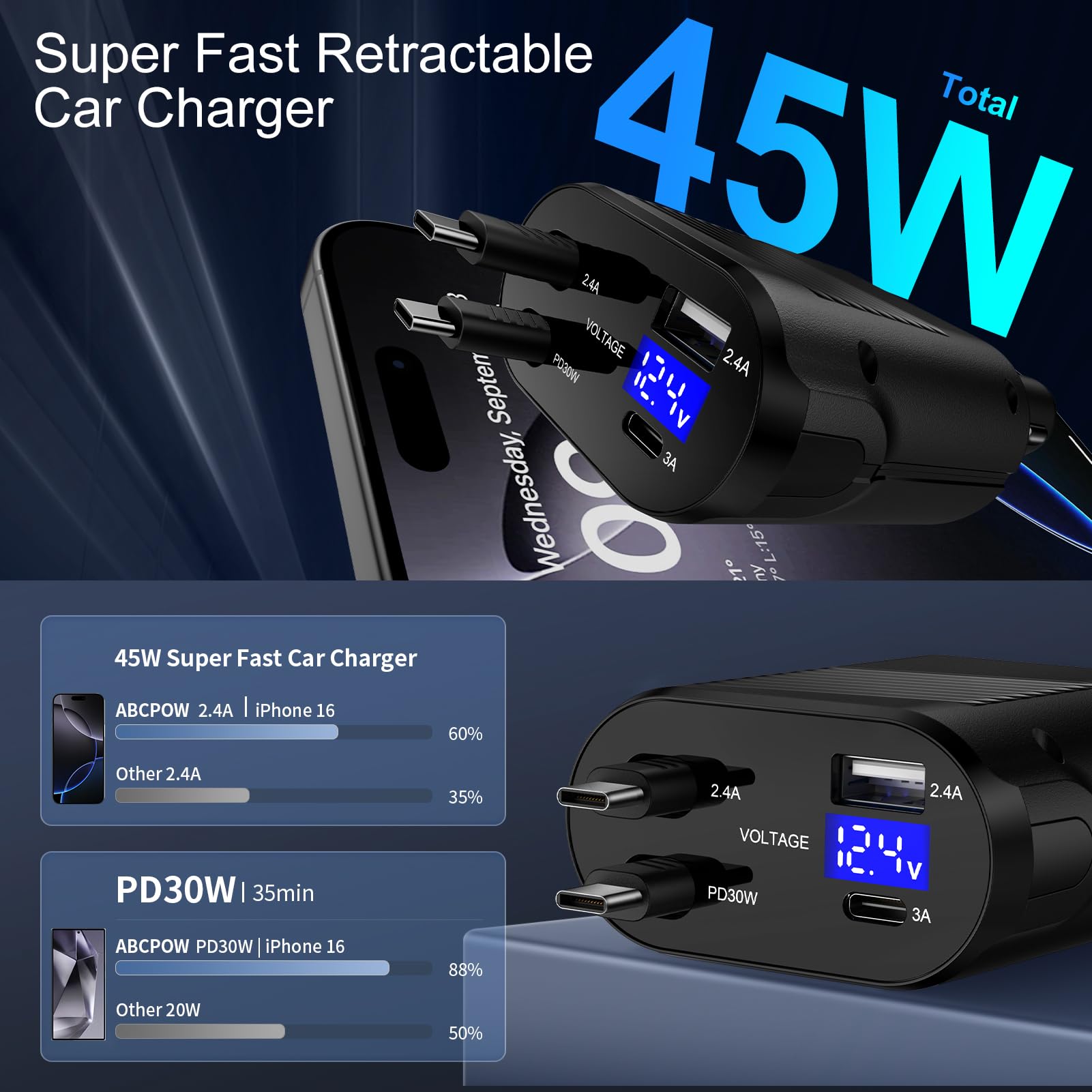 Super Fast Car Charger Adapter Input: 12-24V DC Output(PD): 5V=3A,9V=3A,12V=2.5A Other Output: 5V=3.4A 4 Ports: 30W Retractable USB C Charging Cable, 2.4A Retractable USB C Charger Cable, 3A USB C Port, 2.4A USB A Port 45W iPhone 16 Retractable Car Charger Adapter 1. 30W type c retractable cable super fast charges iPhone 16 from 0% to 80% in just 30 minutes. 2X faster than 2.4A cell phone automobile charger. 2. 2.4A USB-C Port cigarette lighter usb car charger can fast charge iphone 16 from 0% to 60% in just 35 minute 3. USB-C and USB-A Ports cigarette lighter usb car charger can fast charge all cell phones and USB devices. 4. Retractable iphone 16 pro max car charger allows 4 devices to fast charge at the same time. Perfect for the trip. Please Noted: 4 ports iphone 16e car charger charging simultaneous, PD30W port fast charging up to 30W, other 3-ports share 15W. Built-in 3FT Retractable Car Charger Cord USB C The iphone 16 charger cable can extend the length of 2.6 Feet (80CM), takes up very little space and stays tiddy and make you never forgetting to bring the cable. Built-in USB C Cord Compatible with: iPhone 17 Pro Max,17 Pro,17,iPhone Air,iPhone 16e, iPhone 16 Pro Max,16 Plus,16 Pro,16,15 Pro Max/15 Pro/15 Plus/15 Samsung Galaxy S25 Ultra S25+ S25, S24,S24+,S24 Ultra,S23 FE,S23 5G,S23+,S23 Ultra 5G,S23 5G,S22+,S22 Ultra S21 S20 Samsung Galaxy A17 A16 5G A26 A36 A56 A15 A35 A25 A55 A54 A14 A24 A23 5G, A13 5G, A33 5G, A53 5G,A52s 5G Samsung Galaxy Z Fold 7 6 5 4 3, Z Flip 7 FE 76 5 4 3, A52 5G,A52 A72 A32 A12 A06 A05s A04s A03s A02s A22 Samsung Galaxy A20 A20s A21 A21s A30 A30s A31, A32 5G, A40 A40s A41 A42 A50 A50s A51 A60 A70 A70s A71, A71 5g, A80 A81 A90 A91 and more USB-C powered devices. USB C + USB A port Compatible with (Cable is not included): ALL USB Devices