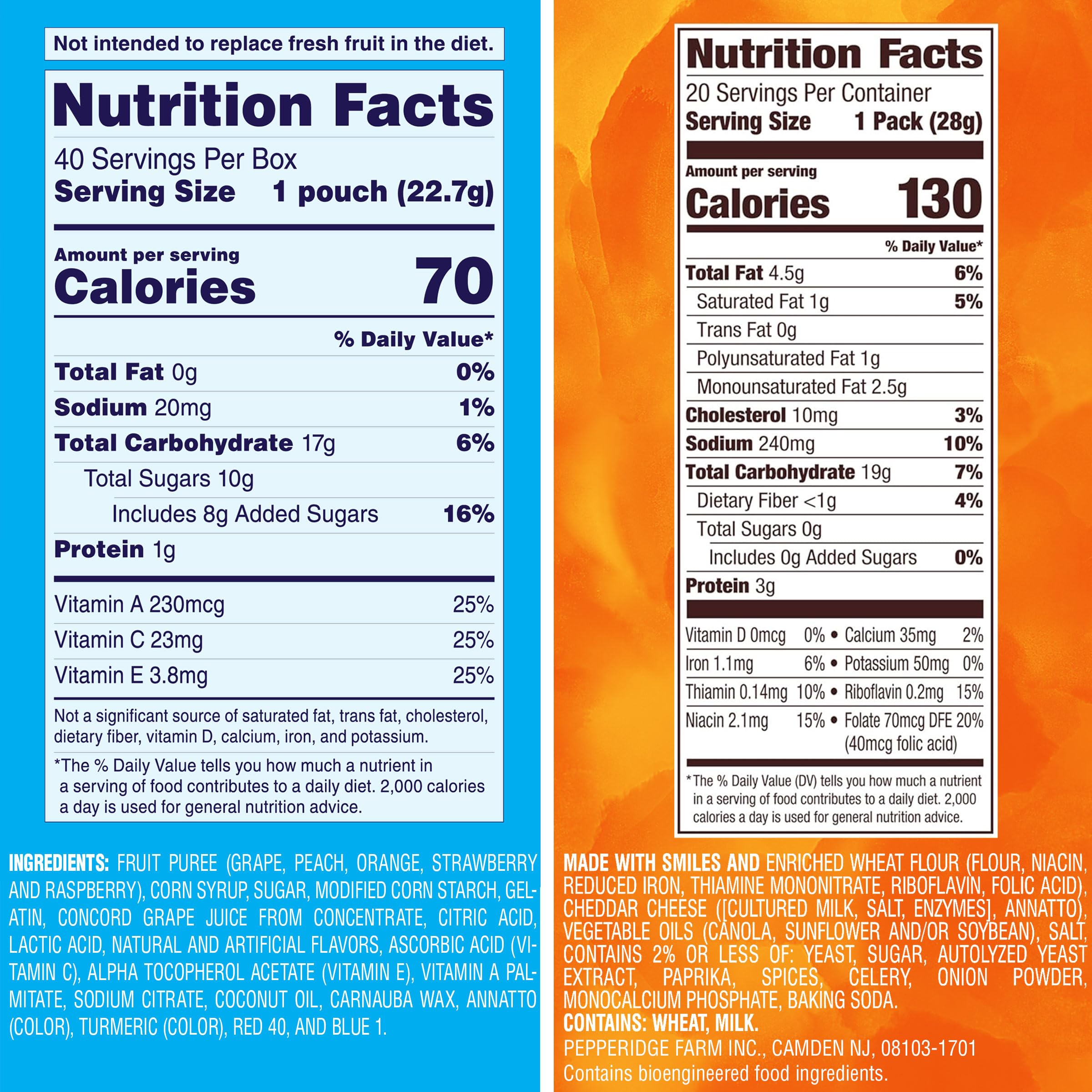 Goldfish snack bags are 1 ounce each; Welch’s Fruit Snacks snack packs are 0.8 ounces each