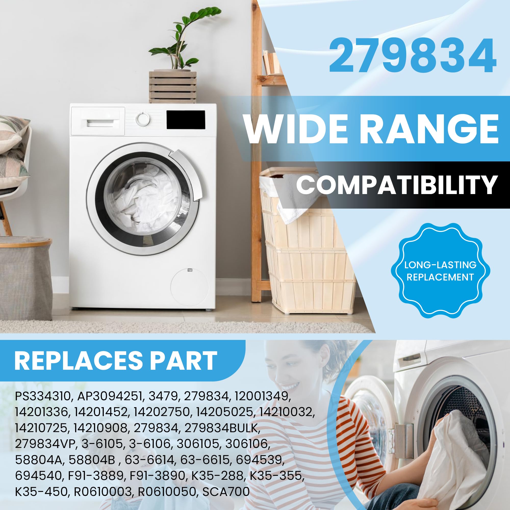 REPLACES: Replaces Part Numbers - 12001349, 14201336, 14201452, 14202750, 14205025, 14210032, 14210725, 14210908, 279834, 279834, 279834BULK, 279834VP, 306105, 306106, 3479, 3-6105, 3-6106, 58804A, 58804B, 63-6614, 63-6615, 694539, 694540, AP3094251, F91-3889, F91-3890, K35-288, K35-355, K35-450, R0610003, R0610050, SCA700. ◆Fit for Whirl-pool, Ken-more, Ama-na, Jenn-Air, etc