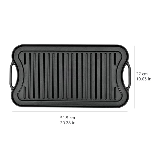 Pre-seasoned cast iron, reversible grill/griddle with user friendly handles; oven safe to 500 degrees Fahrenheit