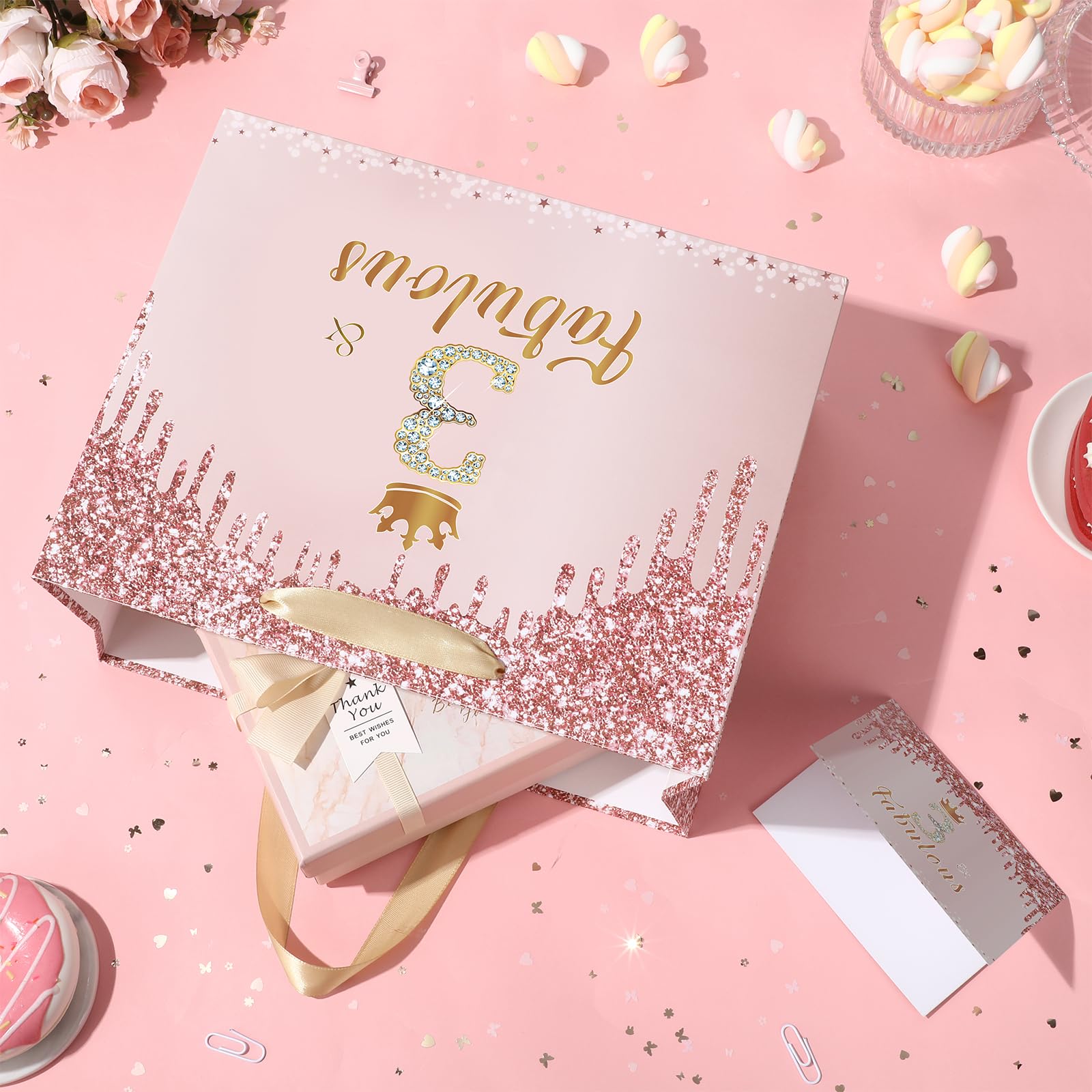 🎁【3 & Fabulous Birthday Gift Bag】The rose gold 3rd birthday gift bag for girls comes in rose gold, gold and silver, which features glitter rose gold prints and 3 & Fabulous.