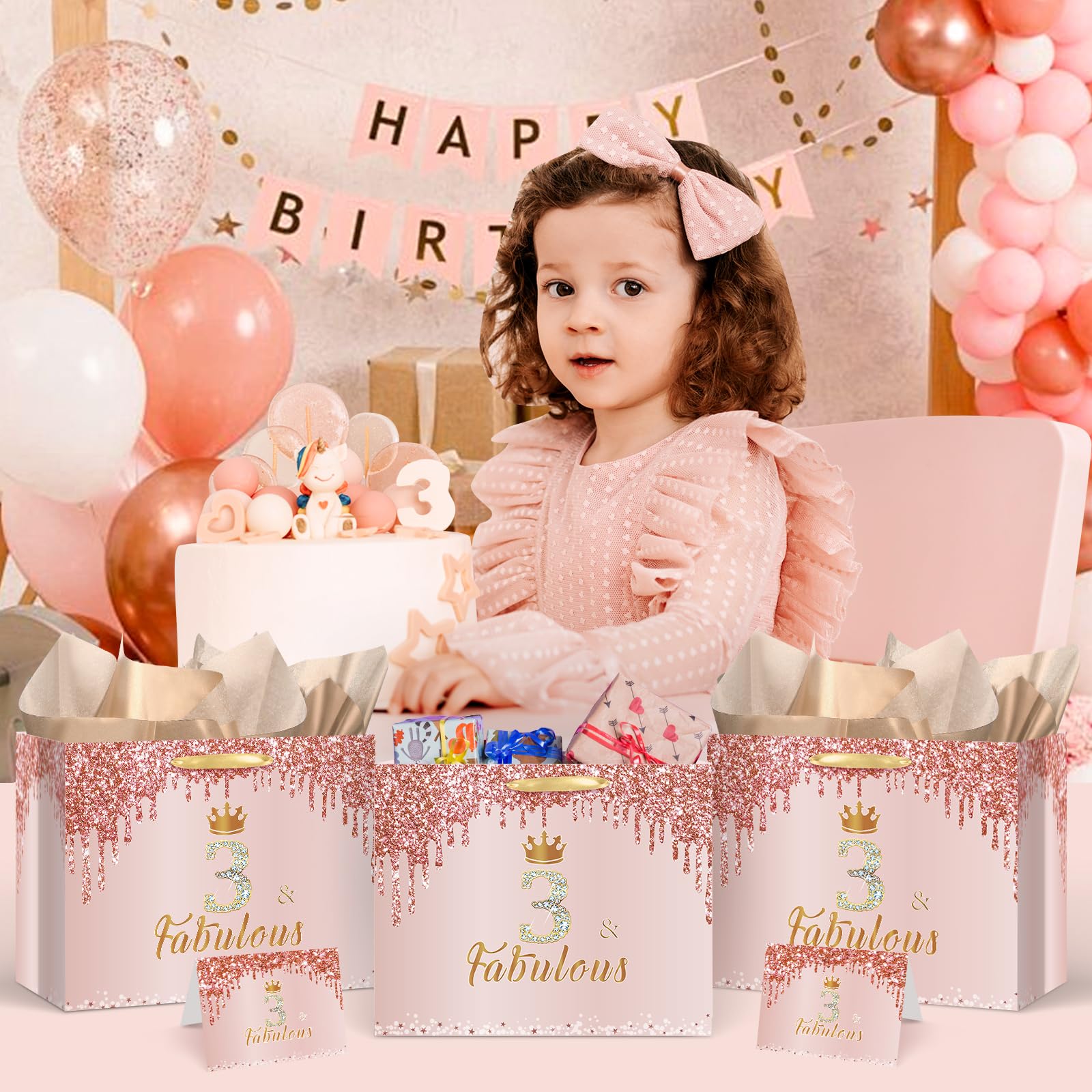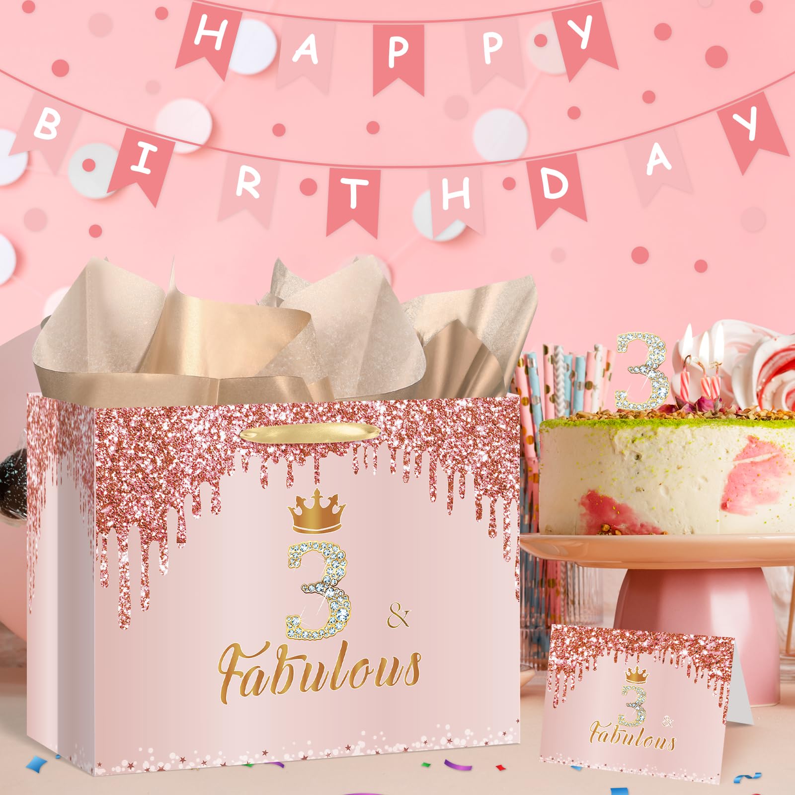 🎁【Package List】You will get a large rose gold 3 & fabulous birthday gift bag for girls, a 3 & fabulous birthday greeting card and 3 pieces of 3rd birthday wrapping tissue paper.