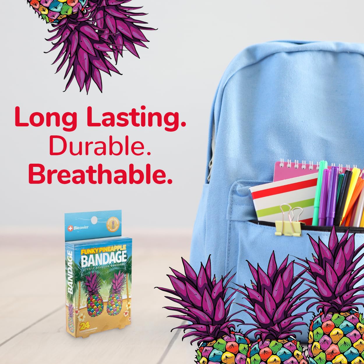 24 FUNKY PINEAPPLE KIDS BANDAGES: Fun pineapple-shaped adhesive bandages pack helps protect cuts, scrapes, and minor wounds while making healing less stressful for children