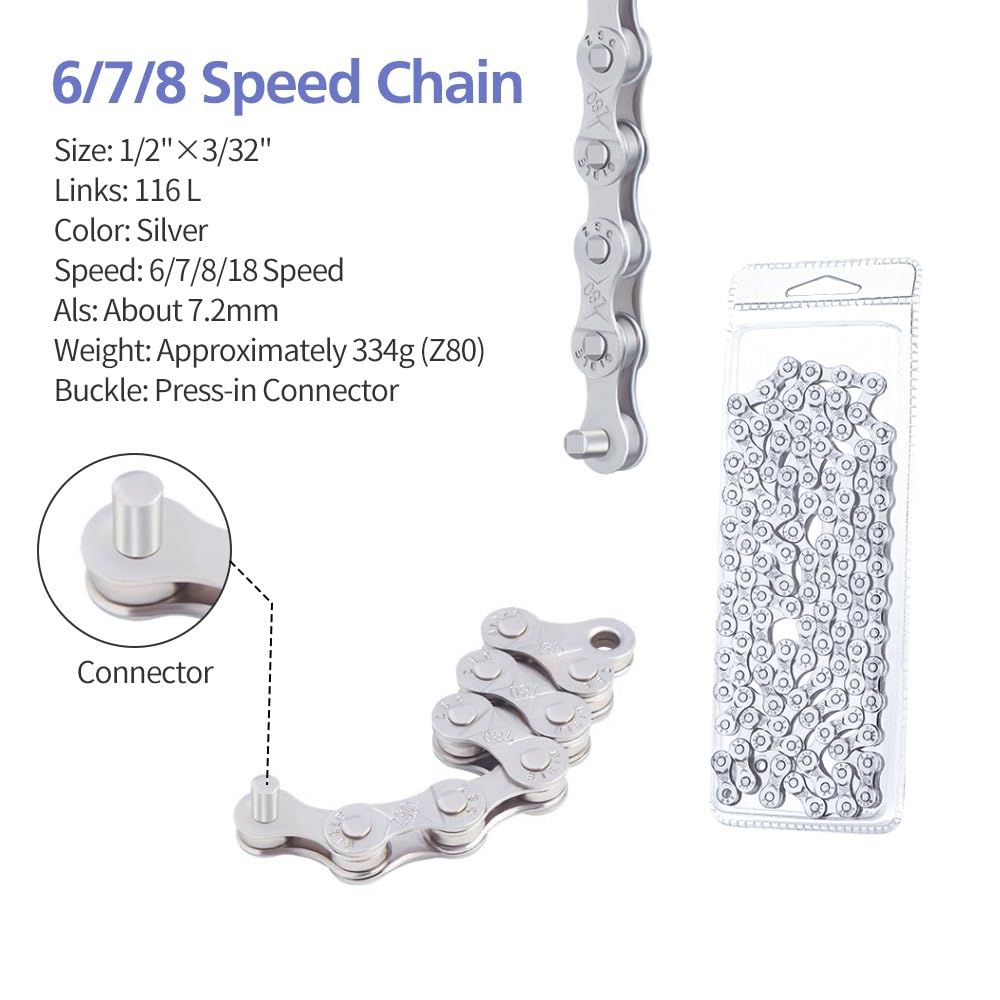 【6/7/8 Speed Chain】- Package includes 1 set 6/7/8 speed bike chain, whose size is 1/2×3/32 inch, the bike chain has 116 links, you can adjust length according to the length of your bike chain.
