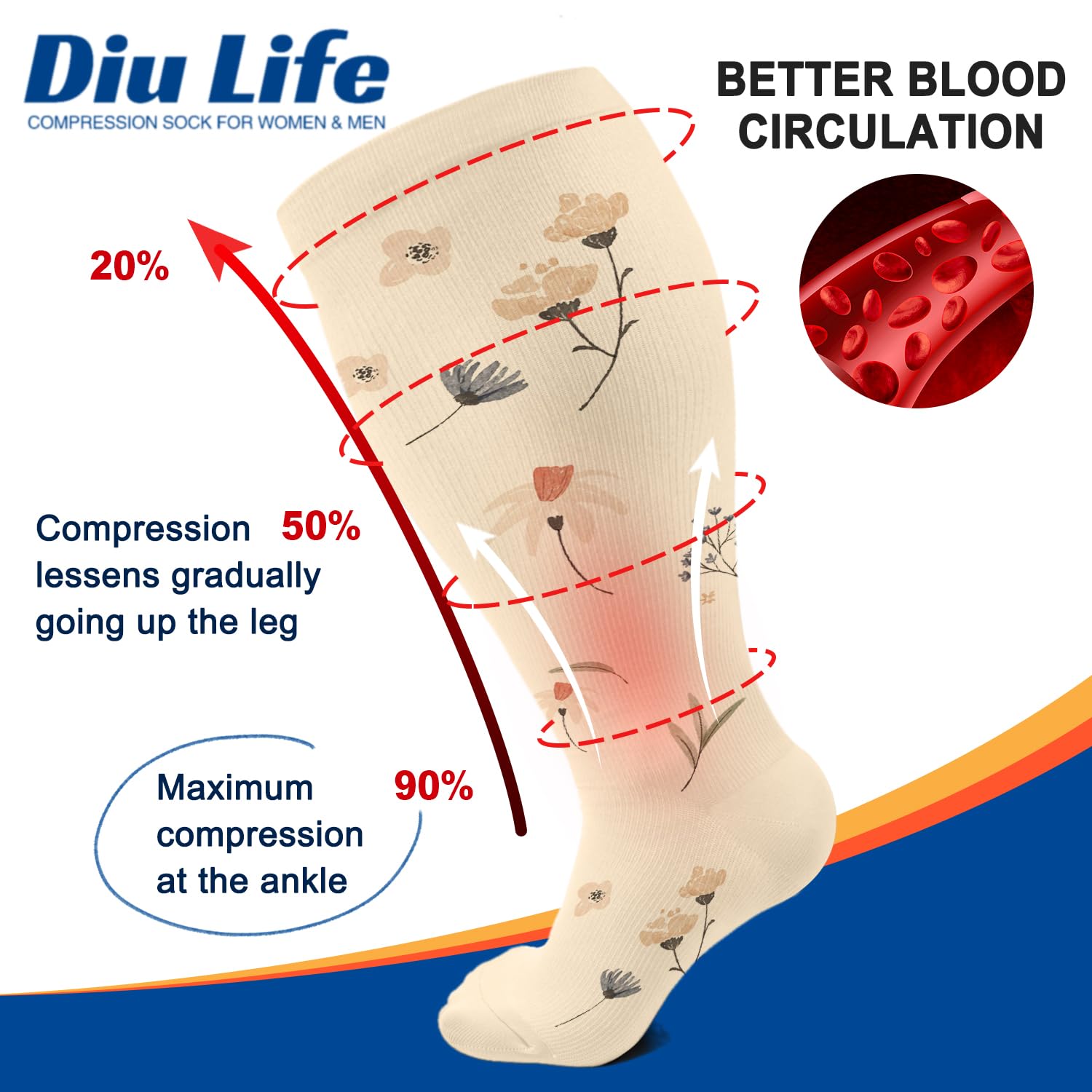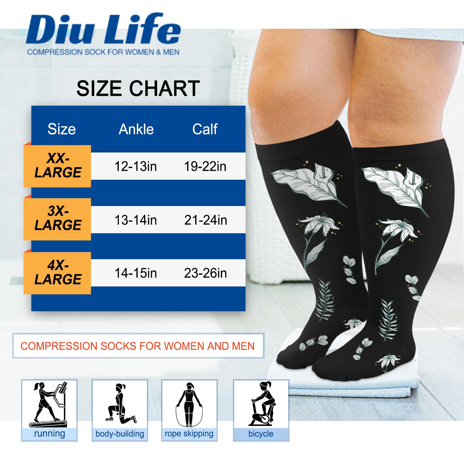 đăWIDE CALF DESIGNă- Diu Life Extra Wide Calf Compression Socks, specially designed for women and men who wear in exlarge or plus size, bring your legs strong support and long lasting comfort. We provide more size choices (2XL-4XL) for ankle up to 16 inches, calf 17 to 28 inchesâ circumference, you can refer to the size chart to choose the suitable size.
