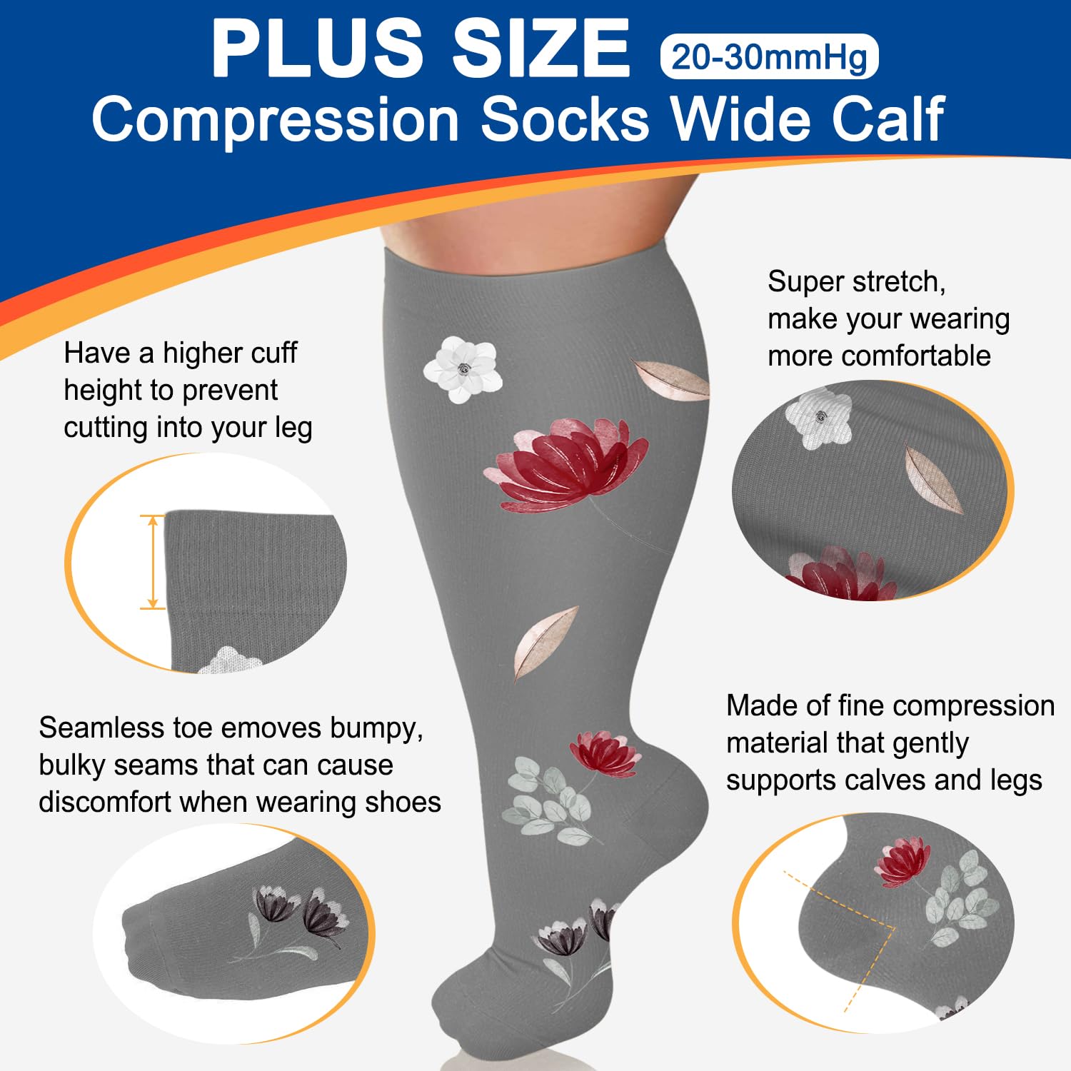 đăCOMPRESSION THERAPY PROMOTES HEALTHă- Our 20-30mmHg Plus Size compression socks with graduated pressure effectively promote smooth flow of blood vessels from the distal end to the proximal end. More improve blood circulation and oxygen flow means more healthier legs and less pain and swelling. It is recommended for legs cure like varicose veins, shin splints, lipedema, blood flow, calf cramps, leg pain or leg fatigue.