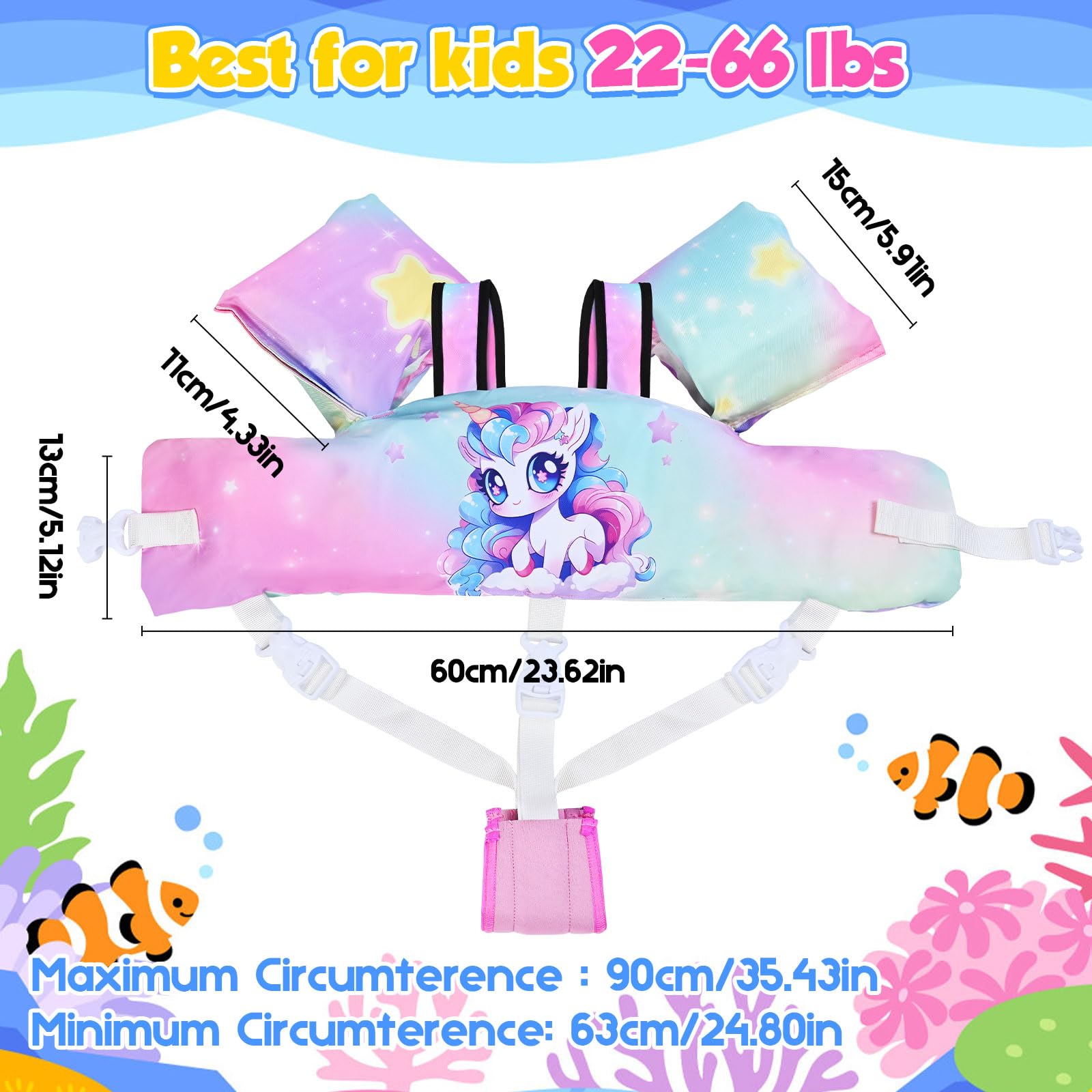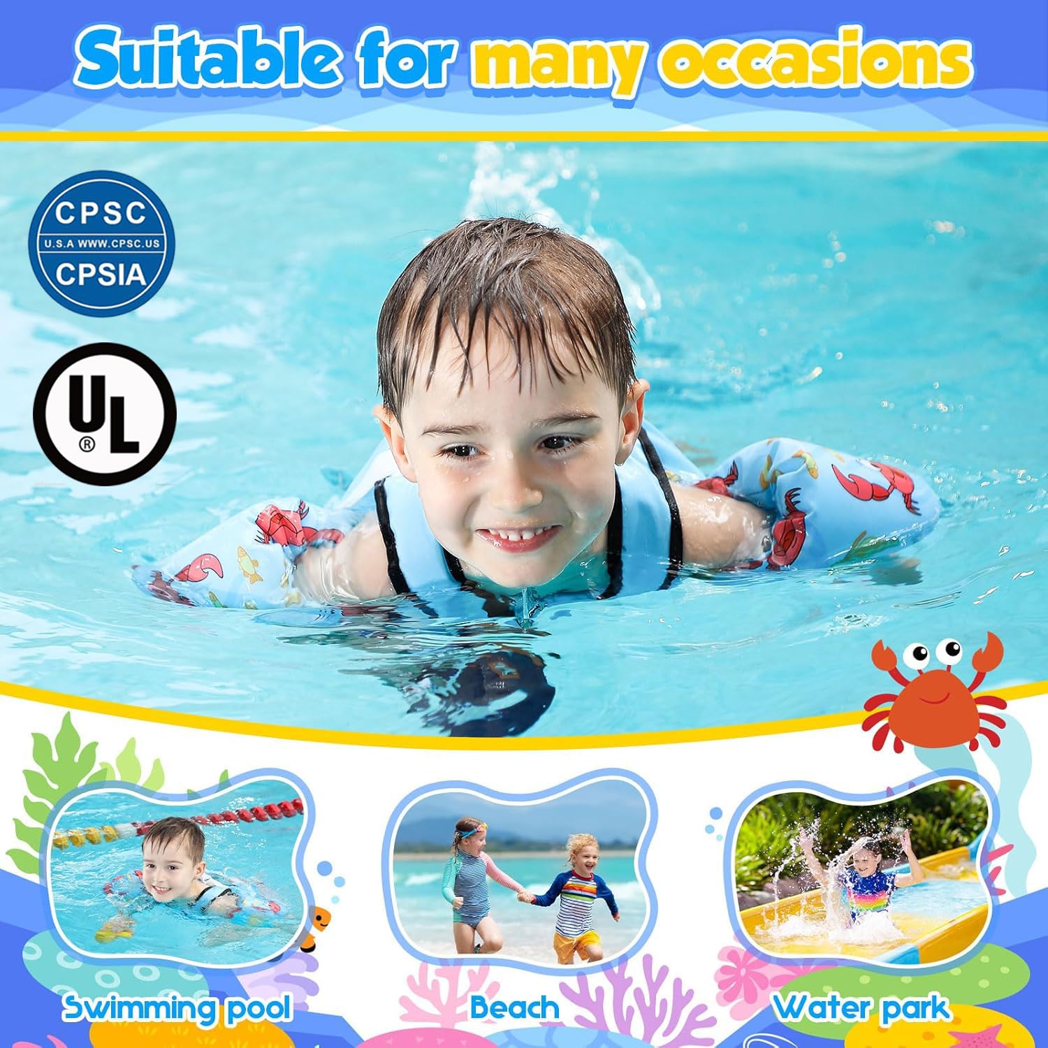 【Cute Cartoon Shape】 Original patent design. Toddler Swim Vest for kids with colorful and lovely graphic designs comfortable fit and feel, help children play safely and add more fun in the water. Bright colors make it easy for parents to notice their children, helping them play safely in the water.
